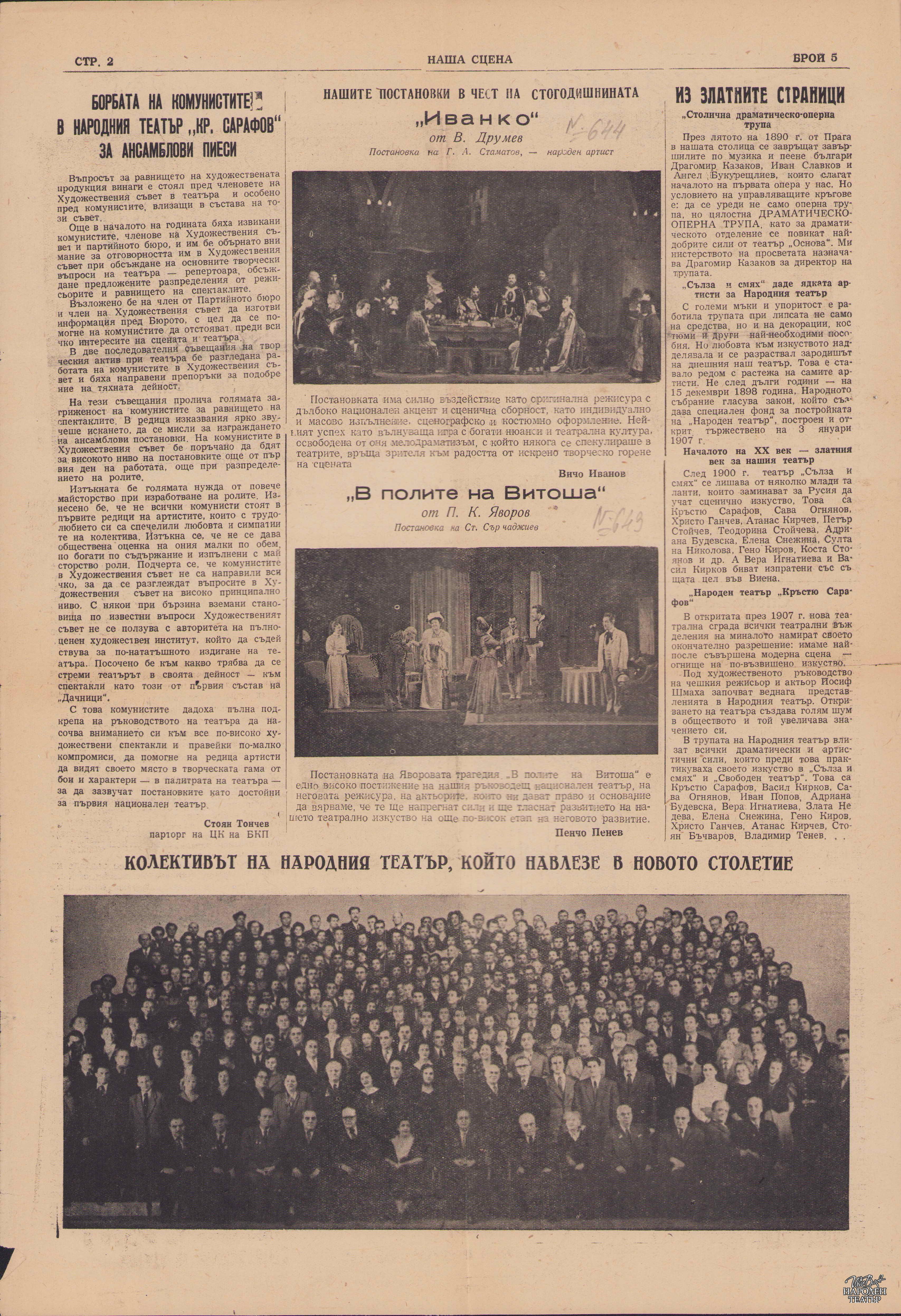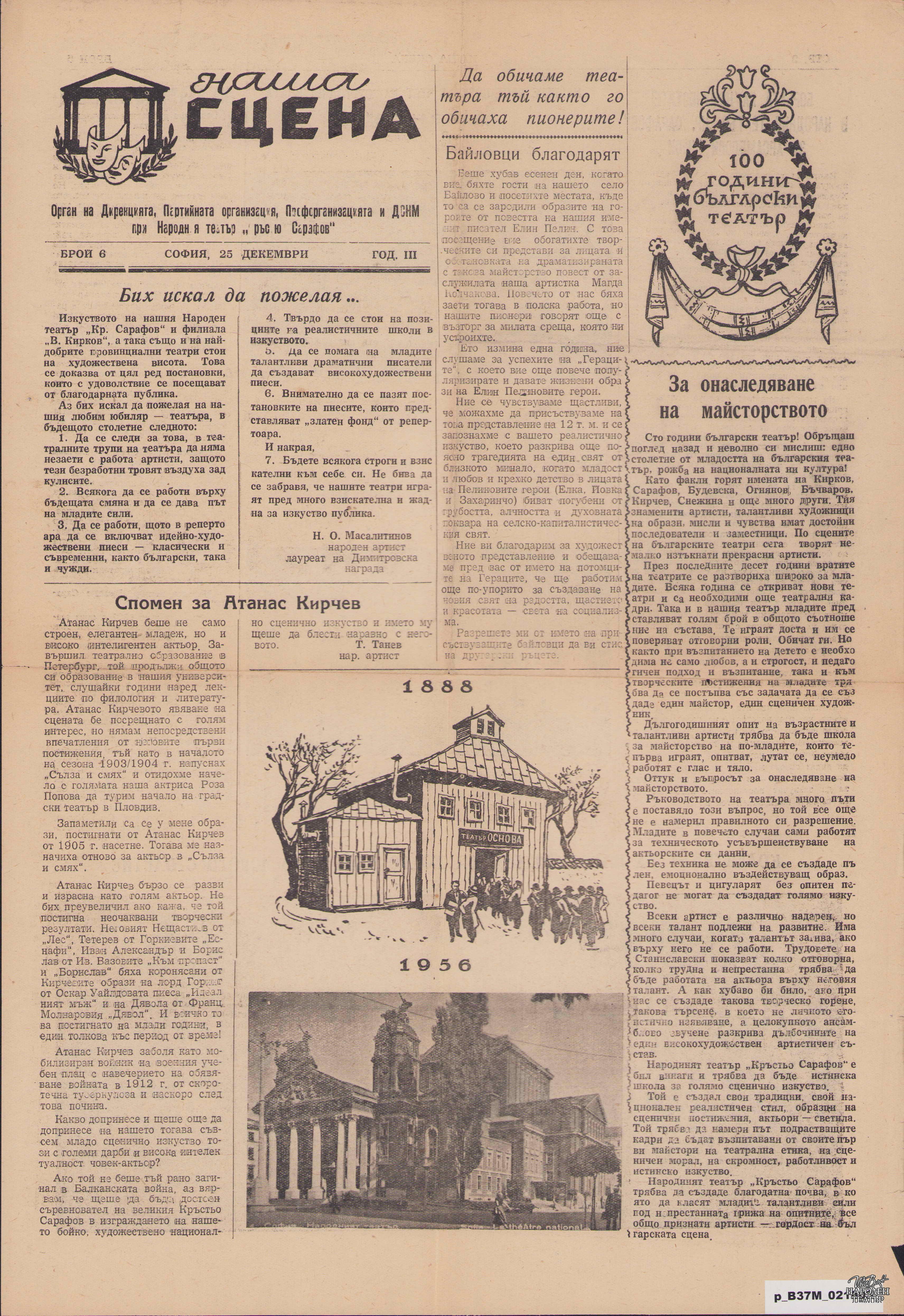 Орган на Дирекцията, Партийната организация, Профорганизацията и ДСНМ при Народния театър "Кръстю Сарафов", III, бр. 6, 26.12.1956. |