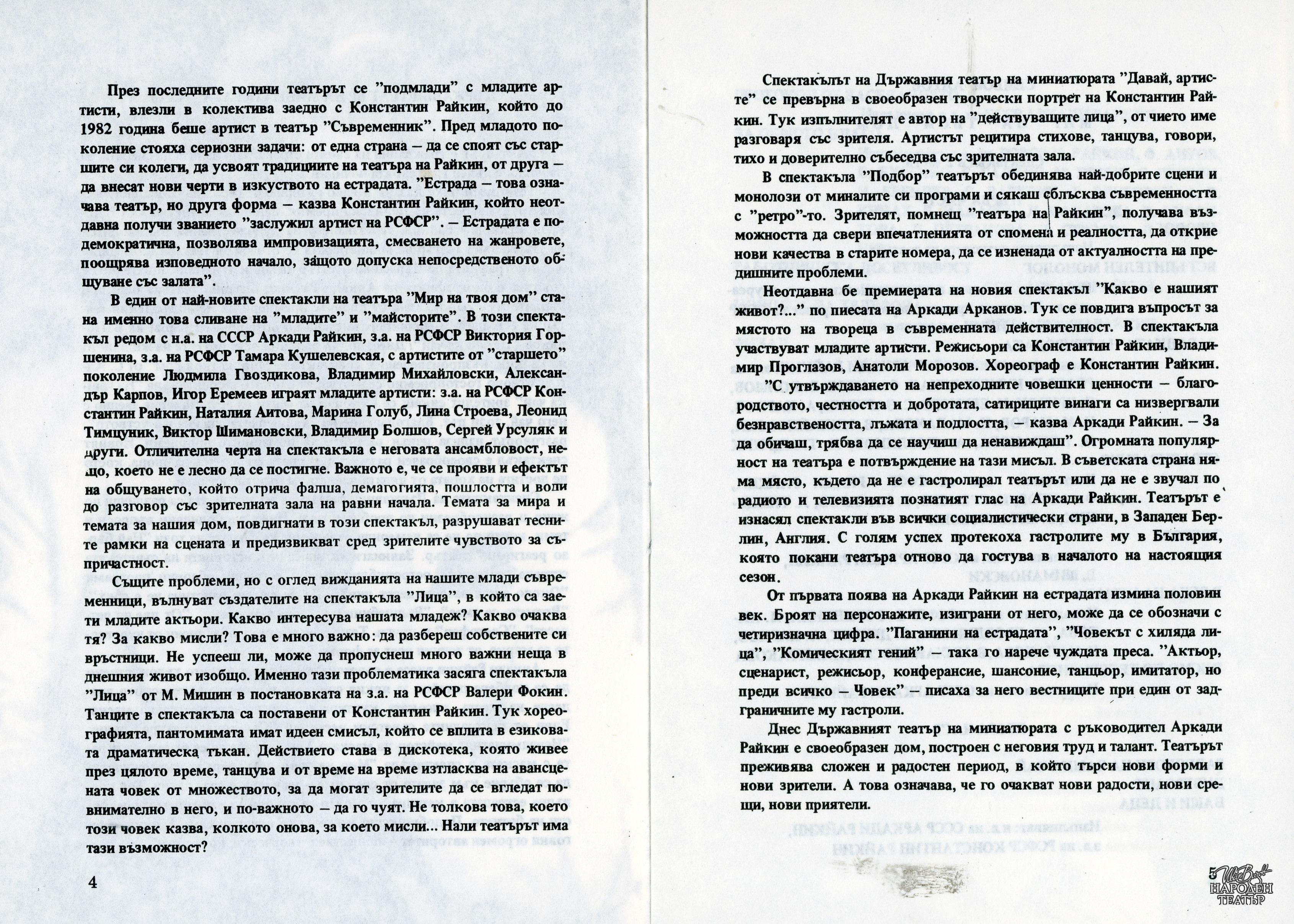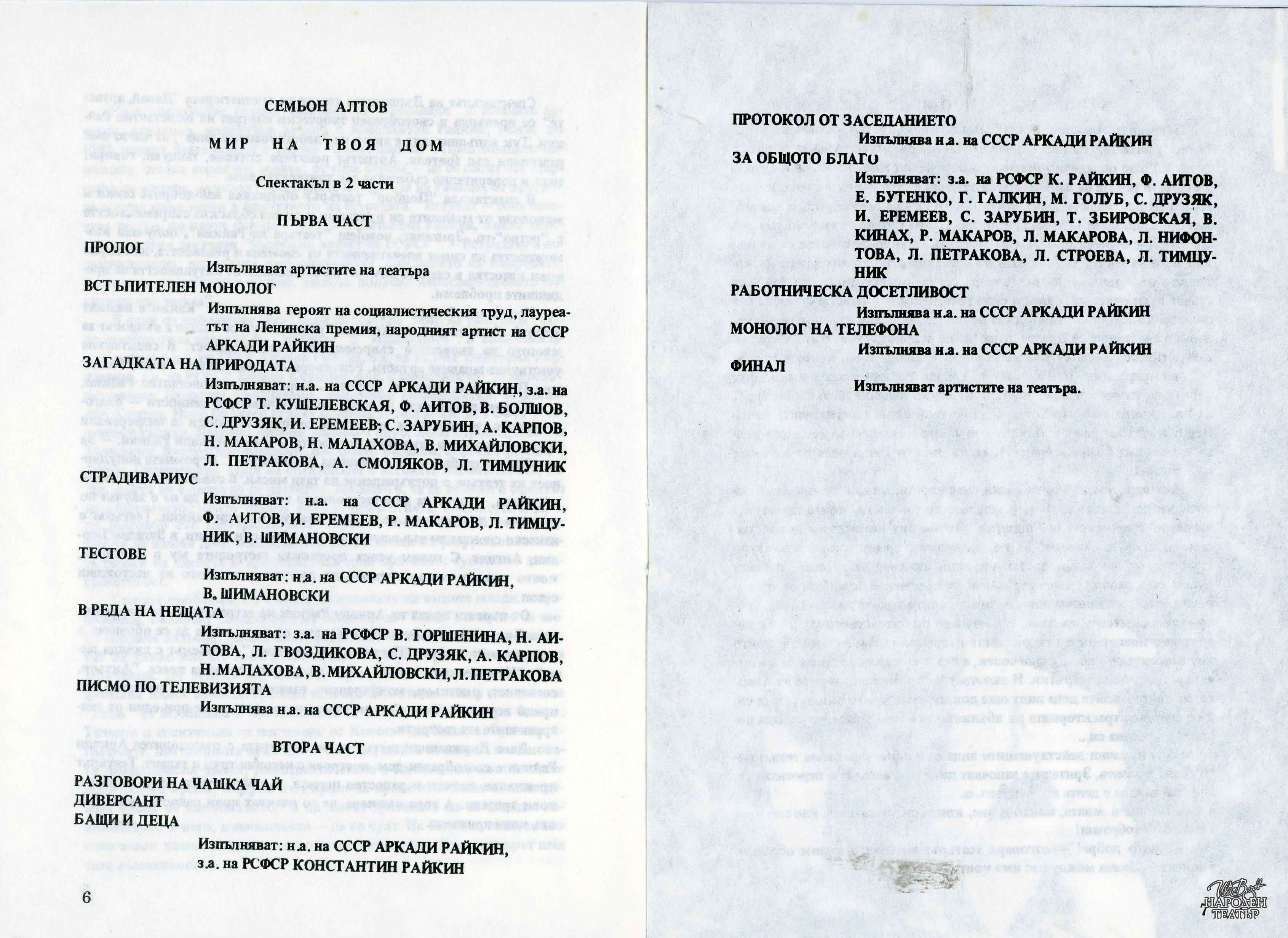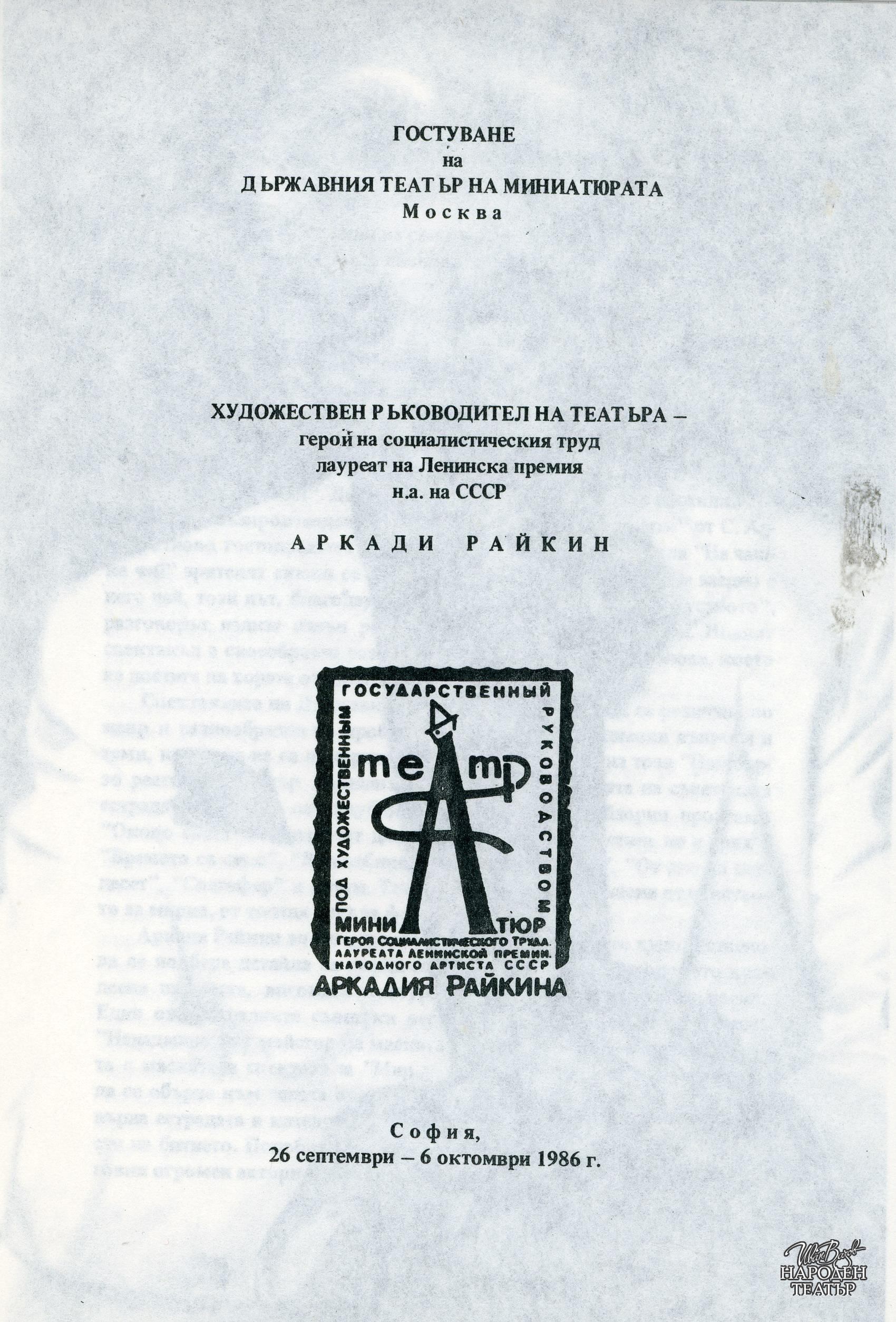 Програма за гостуването със спектаклите "Мир на твоя дом", "Какво е нашият живот?", "Диверсант" в периода 26.09 - 06.10.1986 г. |