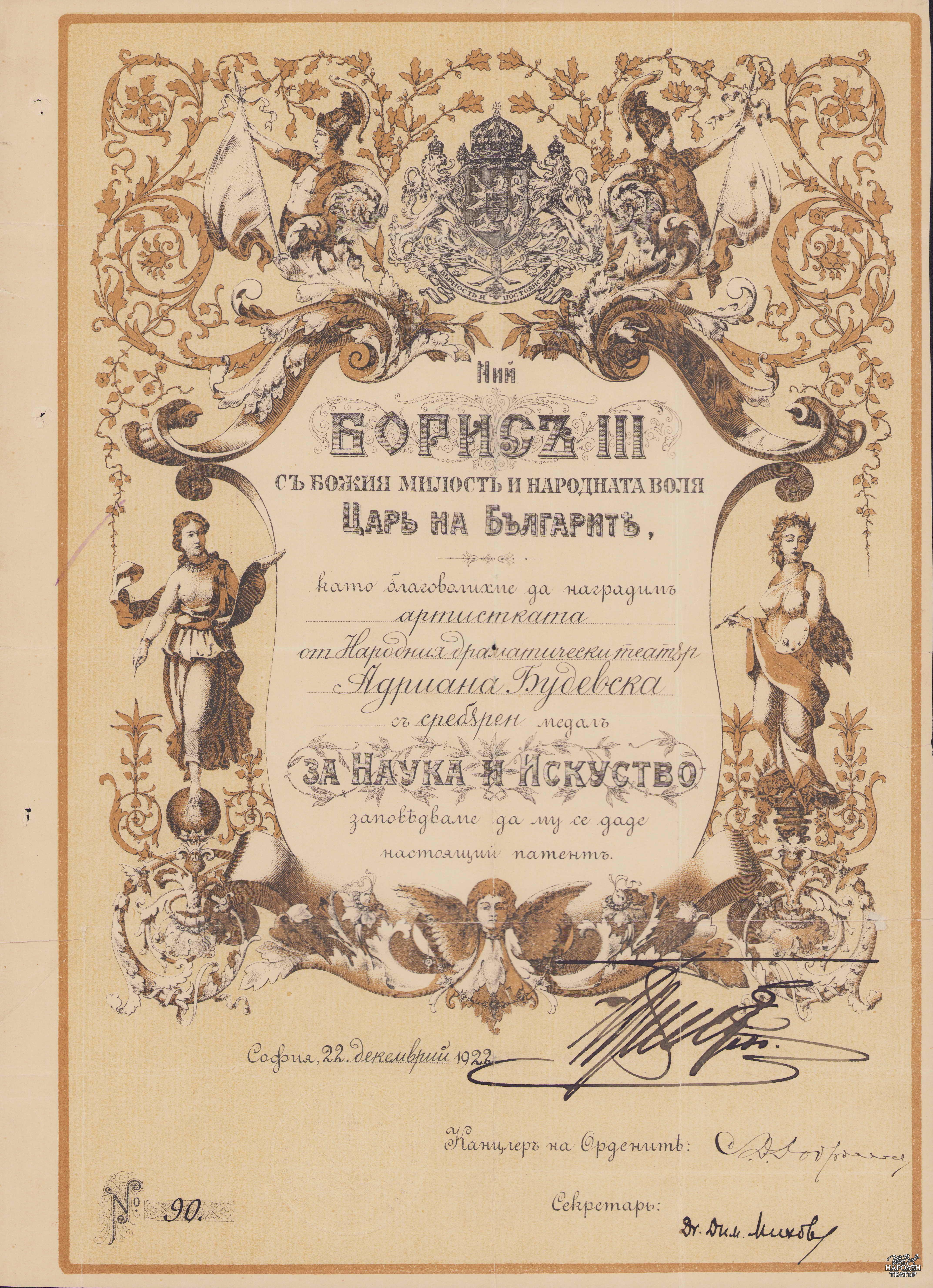 Грамота от цар Борис III за награждаването на АДРИАНА БУДЕВСКА със сребърен медал за изкуство