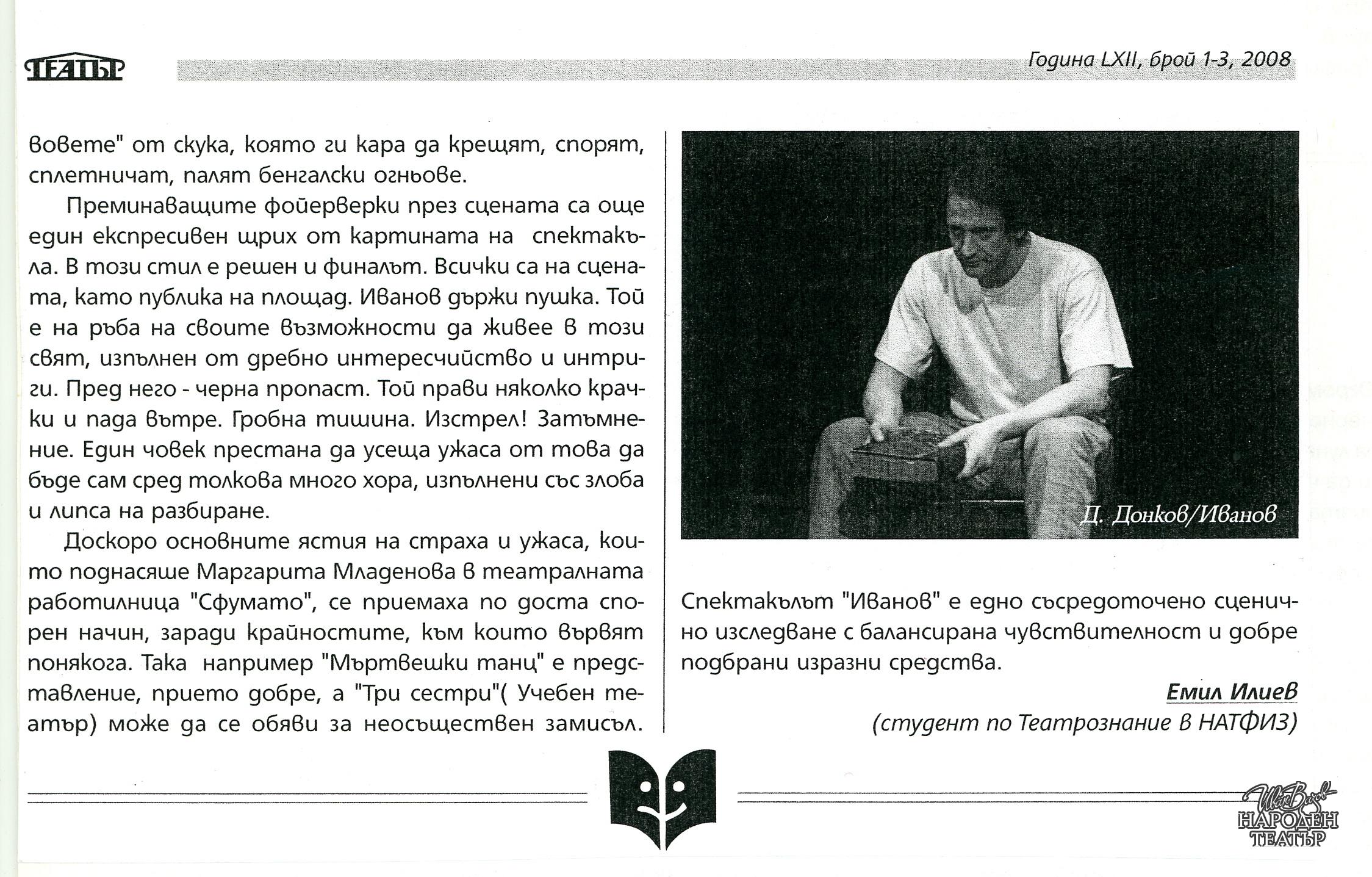 | Източник/ брой, дата, страница | сп. Театър, бр. 1-3, 2008, с. 19 - 20 |