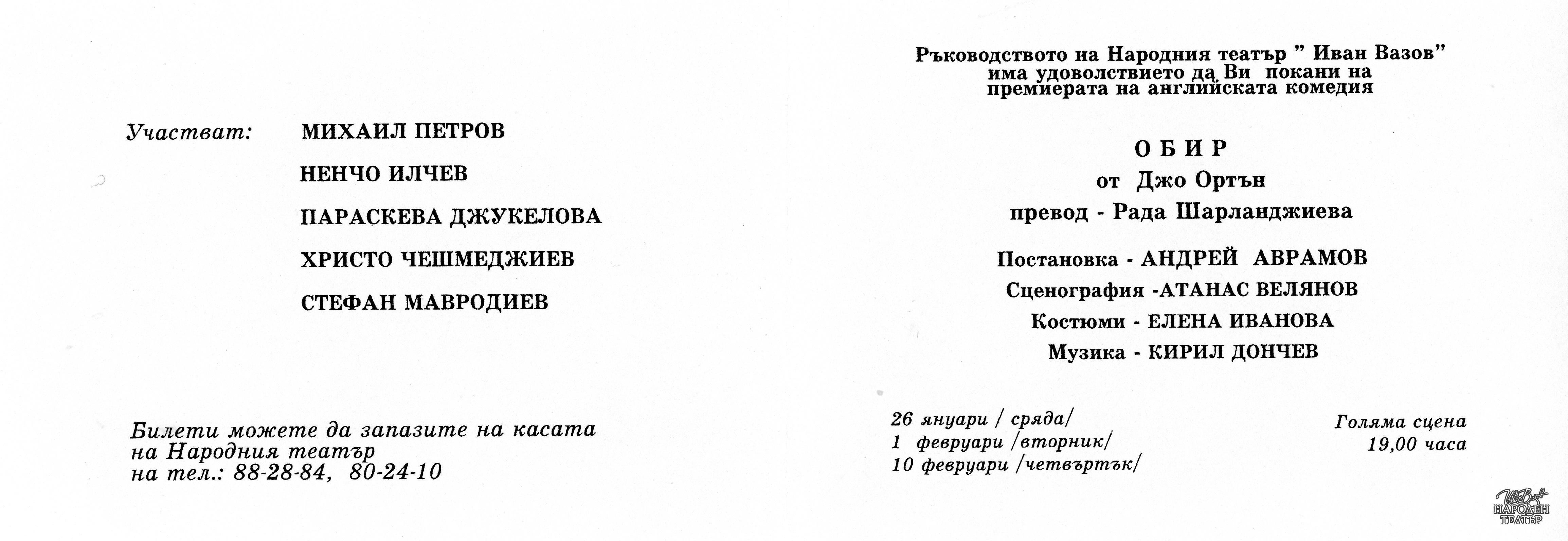 | Институция | Народен театър „Иван Вазов“, гр. София, България |