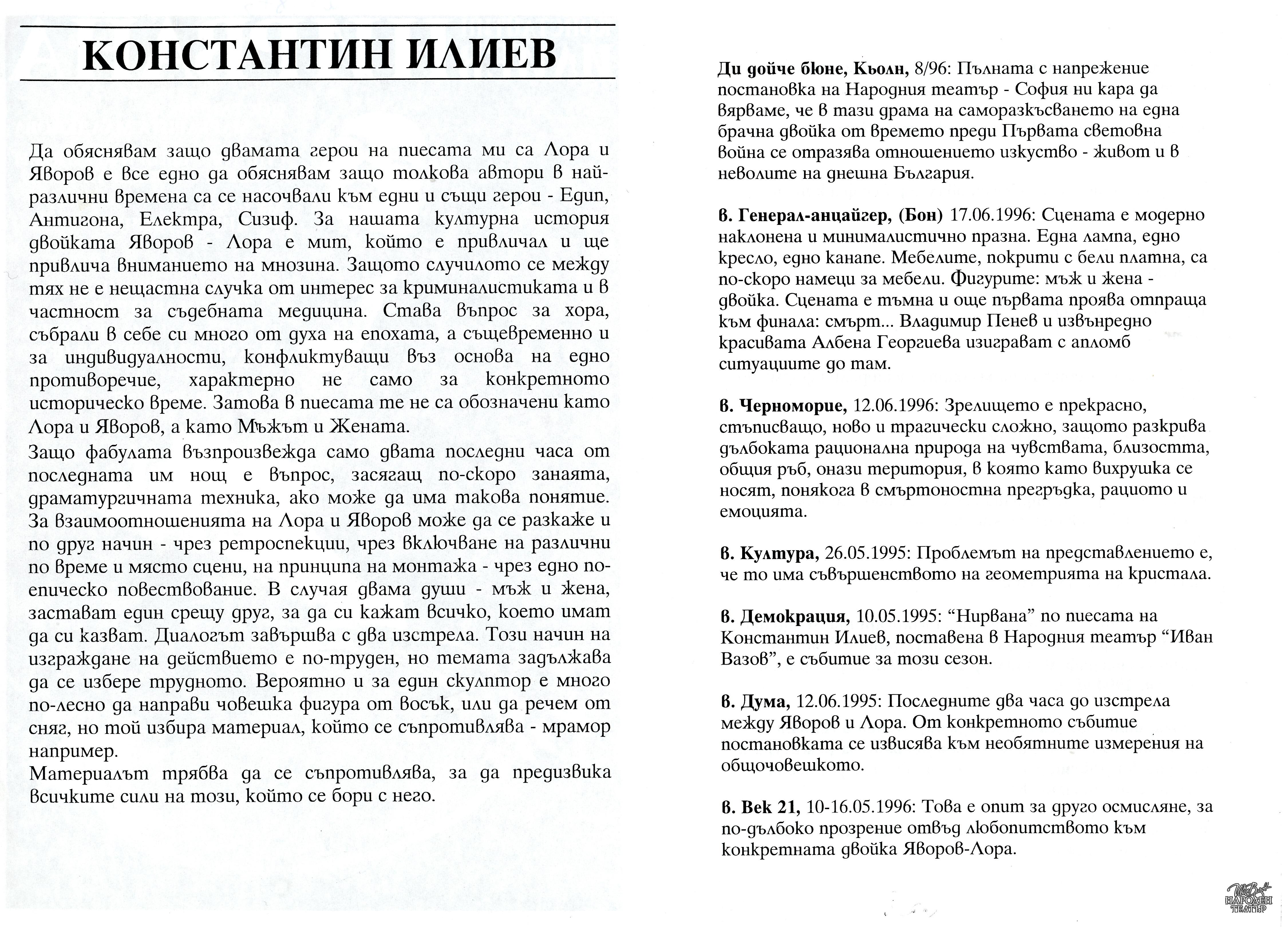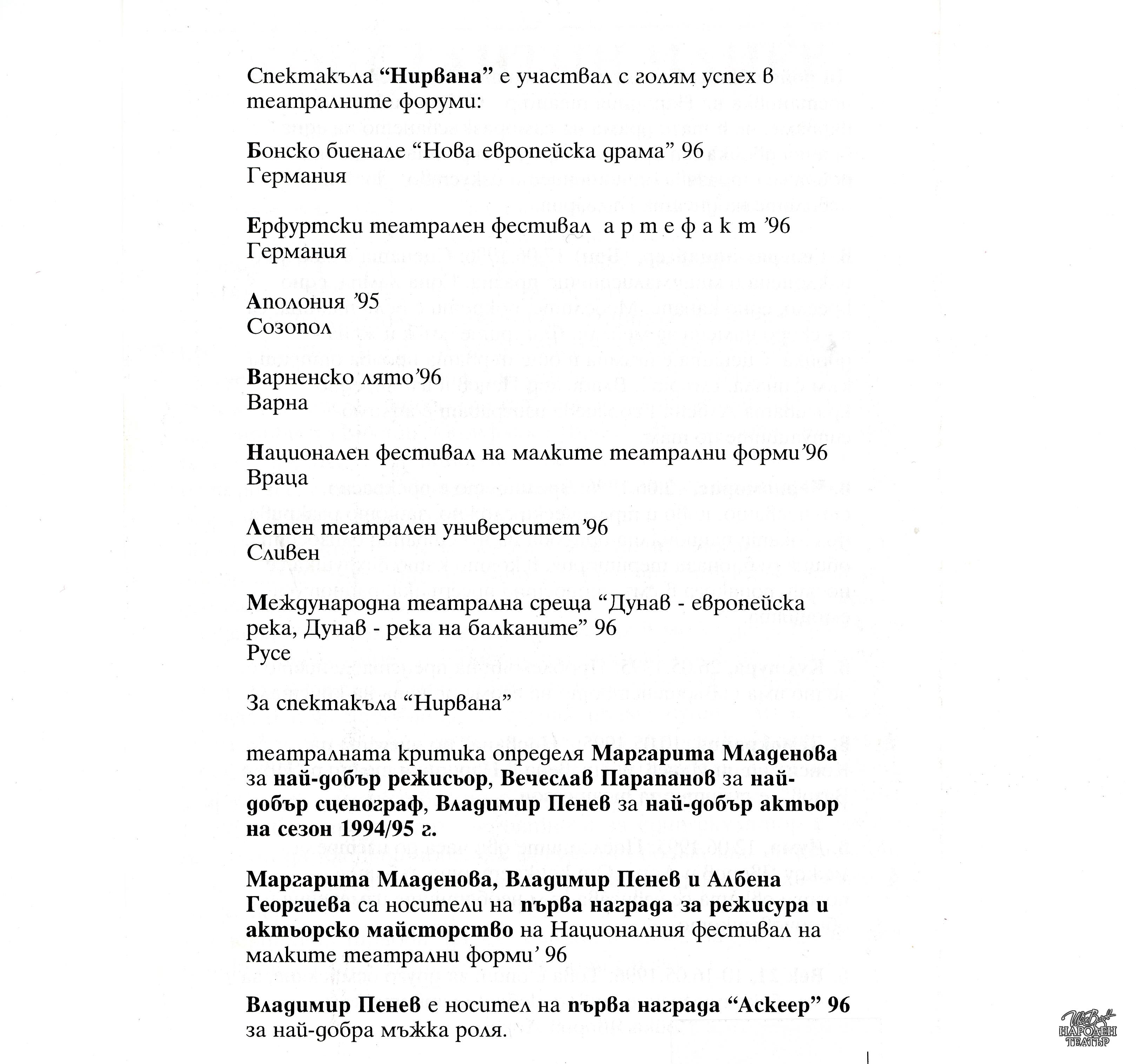 * Програма с участието на НИРВАНА на Третото биенале на новата европейска драма в Бон, Германия, 1996 г. |