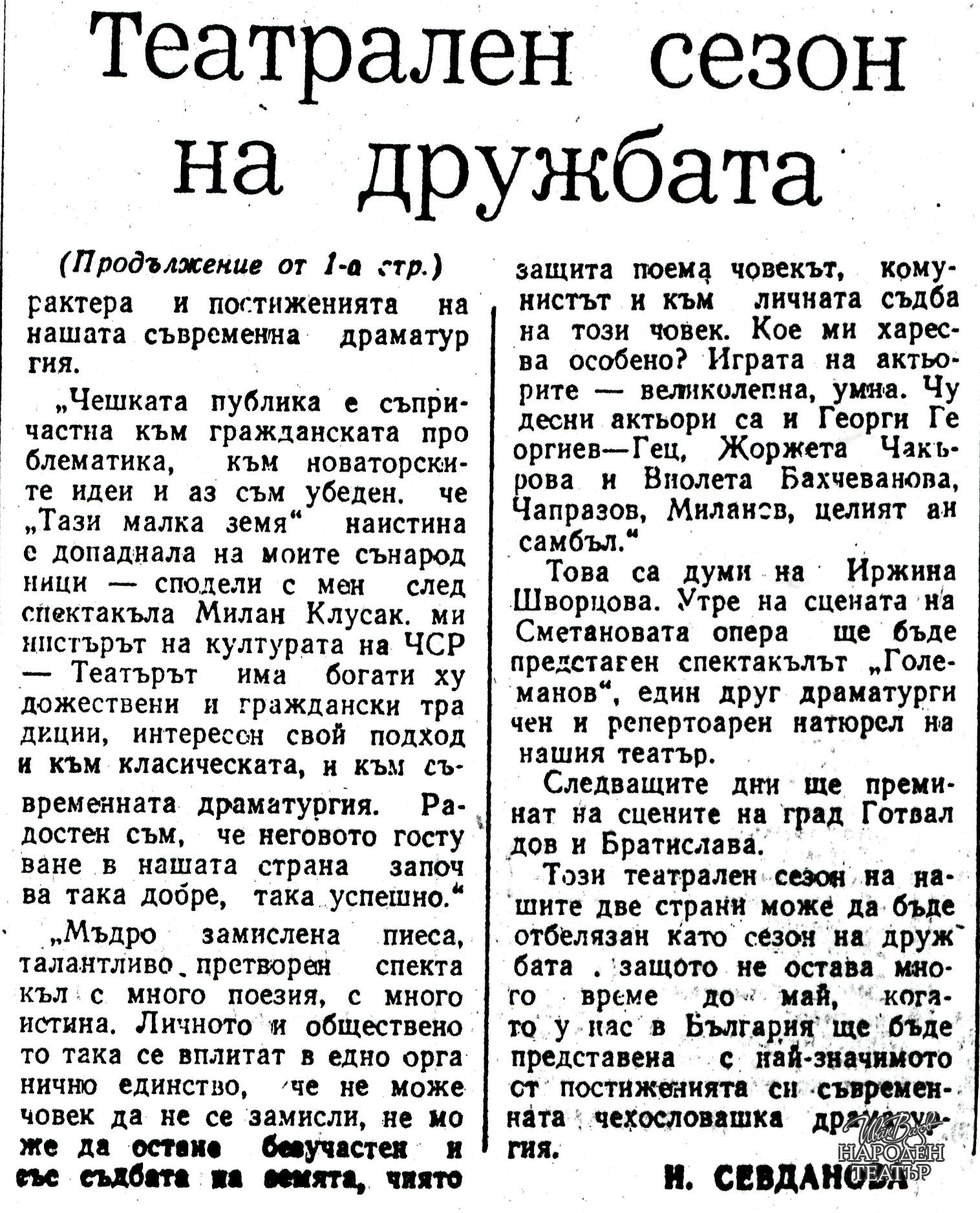 "Тази малка земя" (1974 г.) и "Големанов" (1977 г.) са играни в Прага, Братислава и Готвалдов, ЧССР, през март 1977 г. |