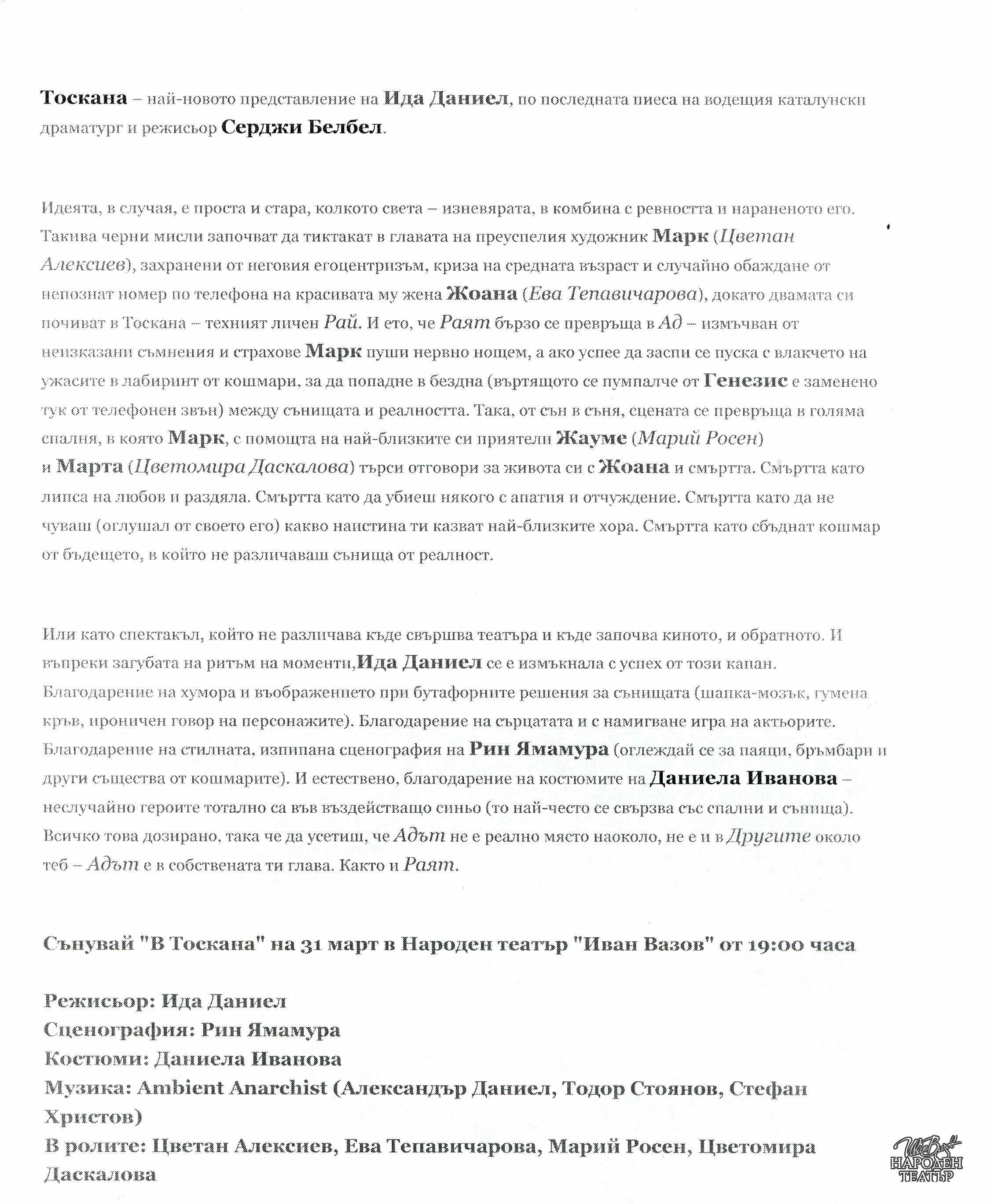 | Институция | Народен театър „Иван Вазов“, гр. София, България |