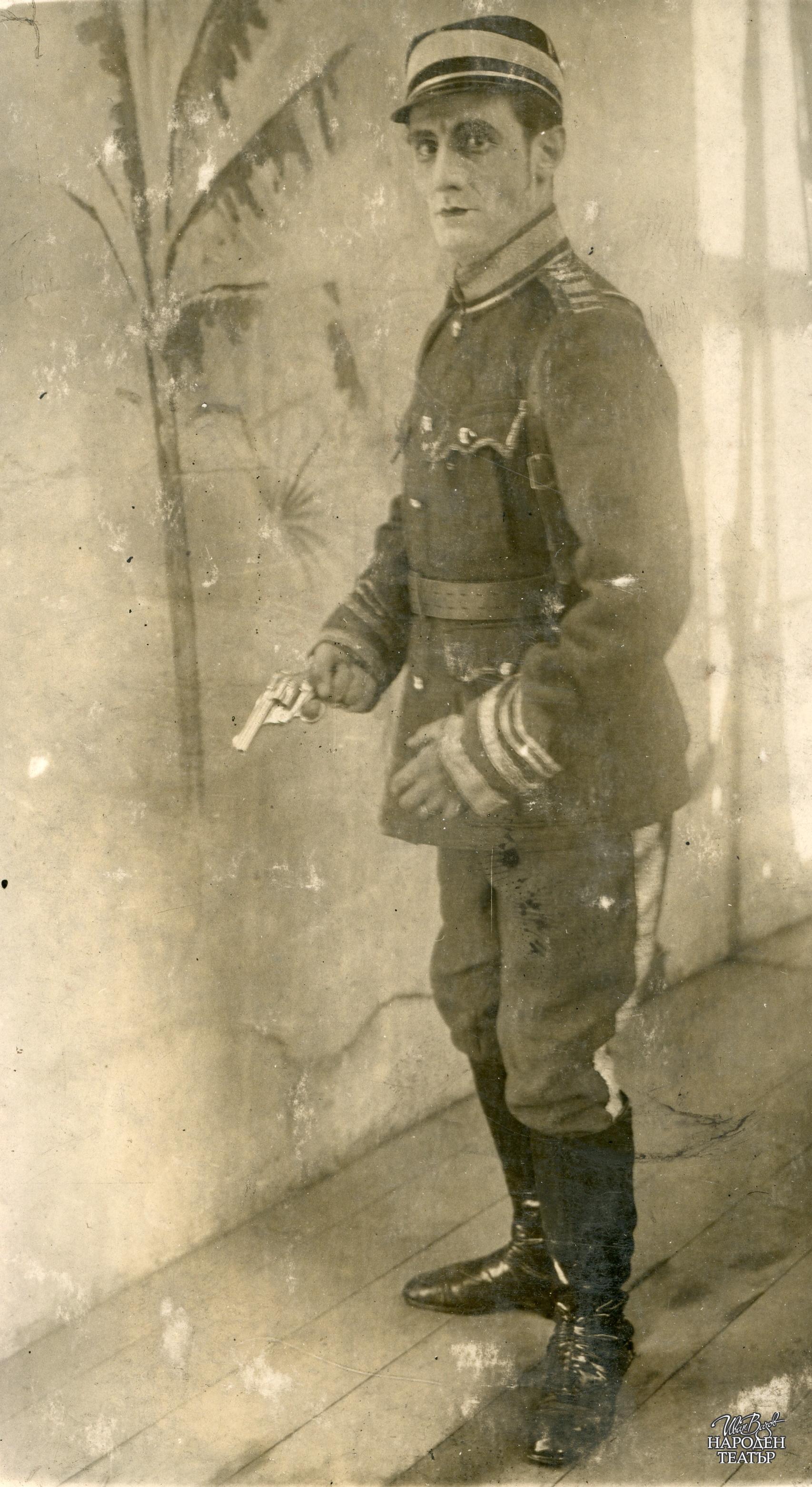 Снимки на Васил Гендов в роли като артист в театър "Роза Попова" и Софийски областен театър: Стефан Тачев в ролята на началника на граничната охрана от пиесата "Кръвта на Тьорберг"