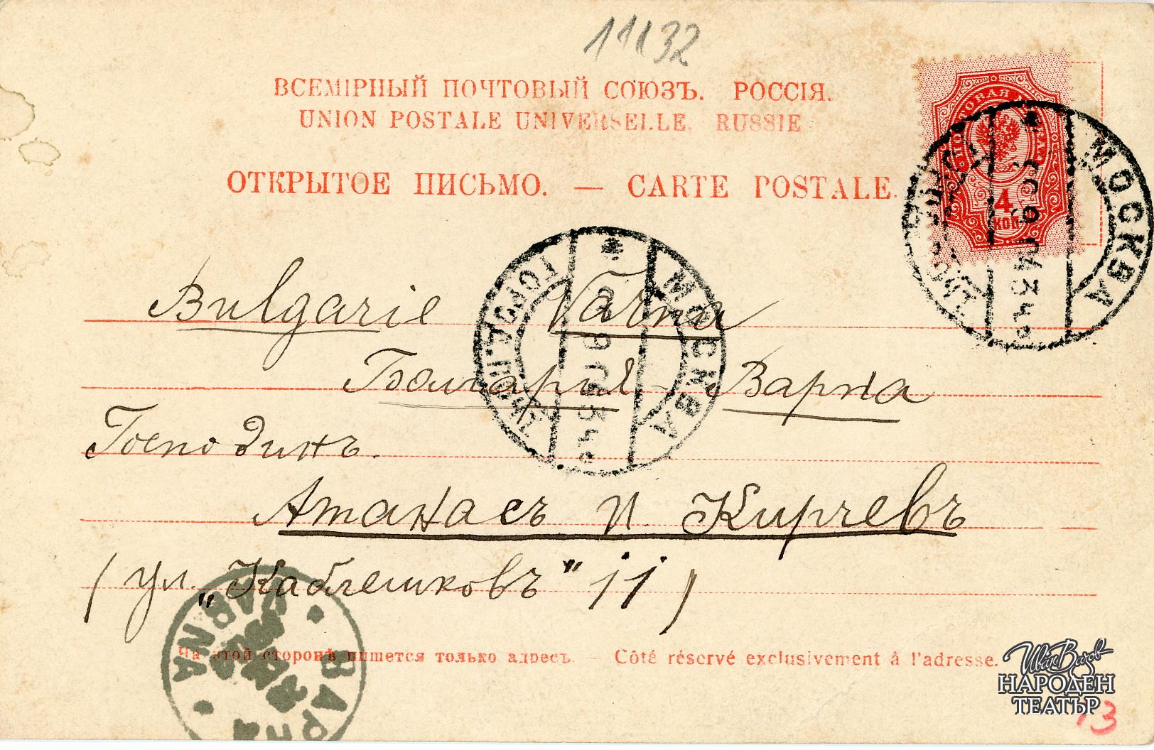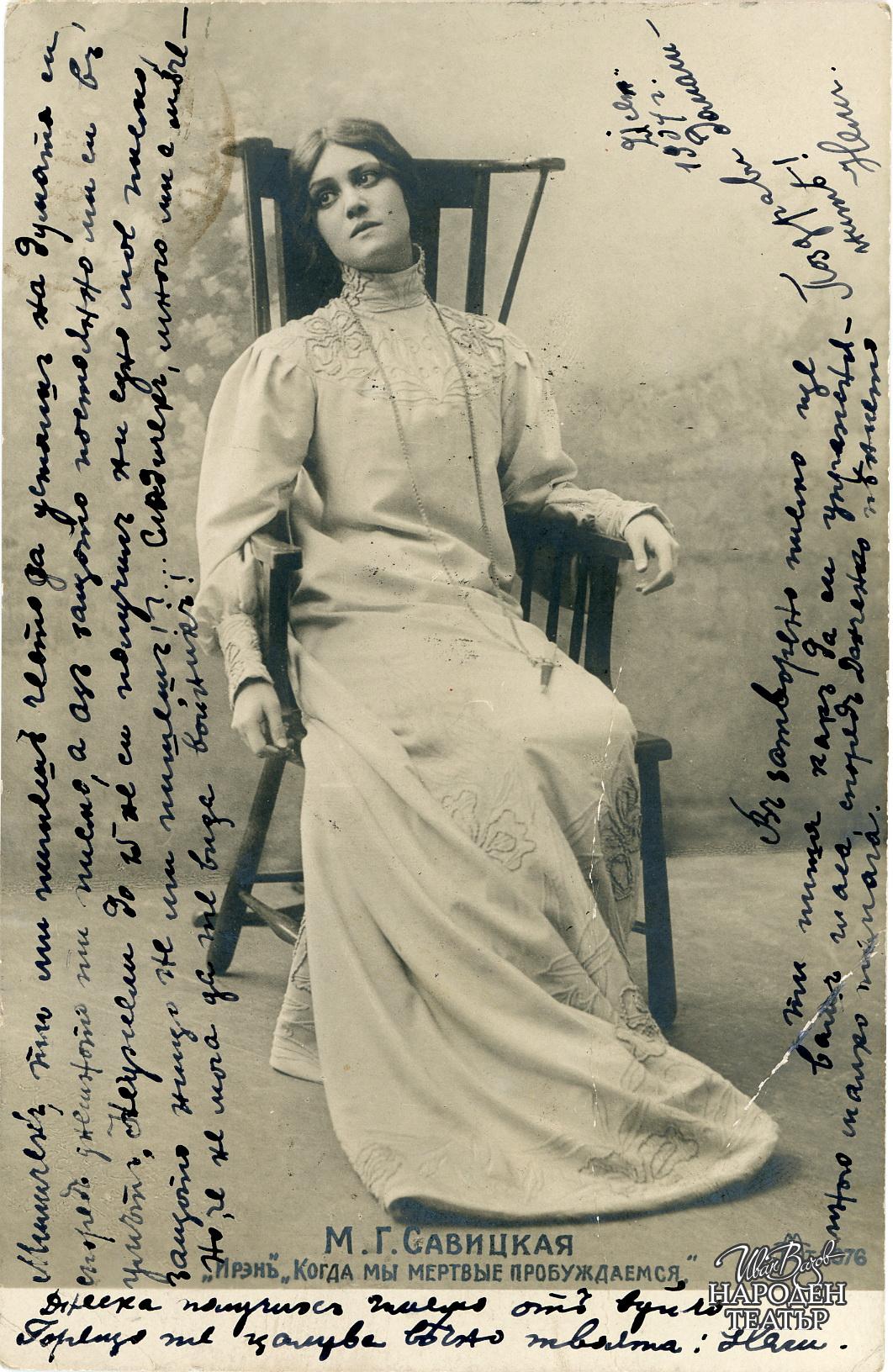 Адресирана до Атанас Кирчев в гр. Варна, изображение на актрисата М. Савицкая в ролята на Ирен в "Когато ние мъртвите се пробудим". |