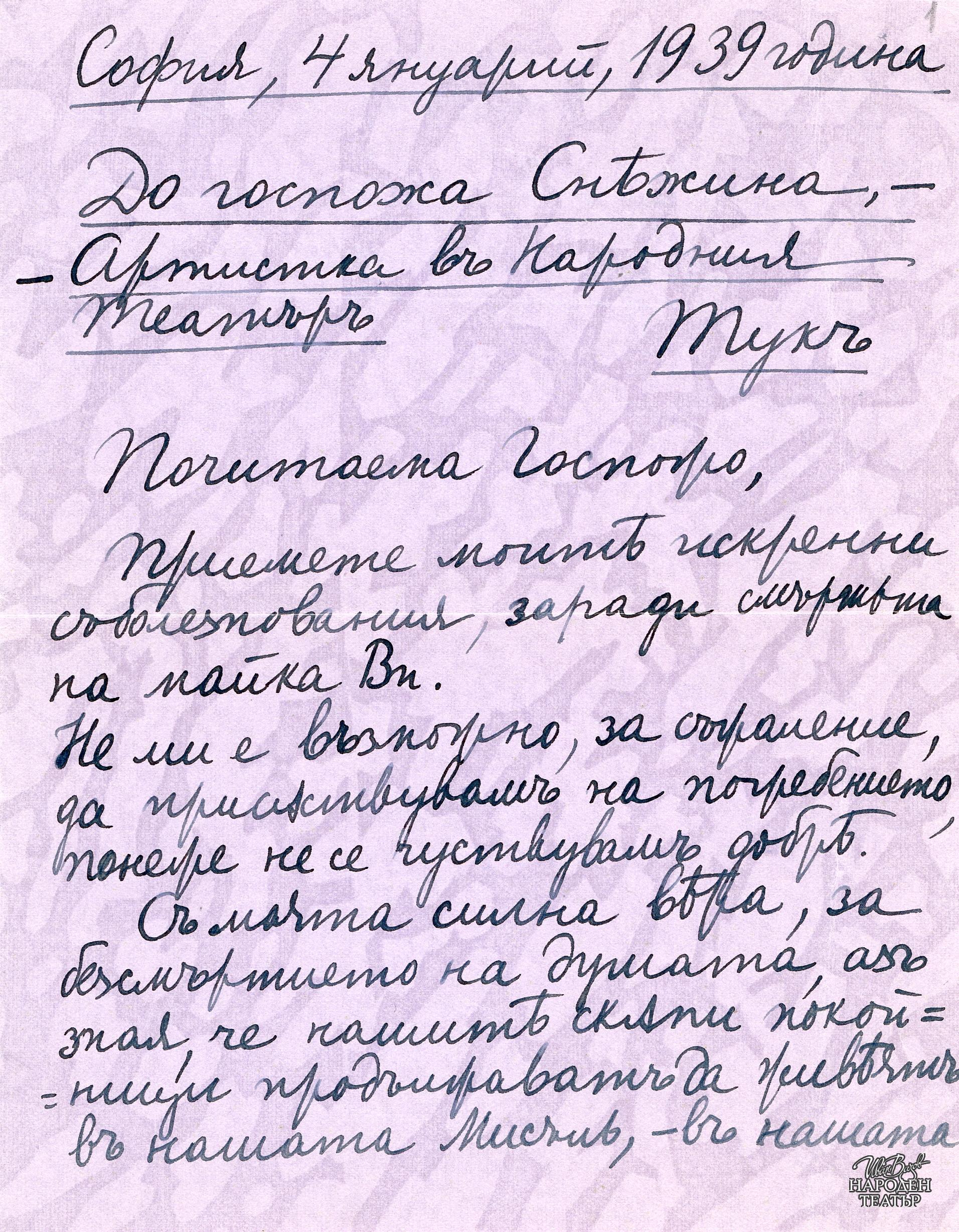 Съболезнователно писмо от Мара професор Милева до Елена Снежина по повод смъртта на майка й от 4.1.1939