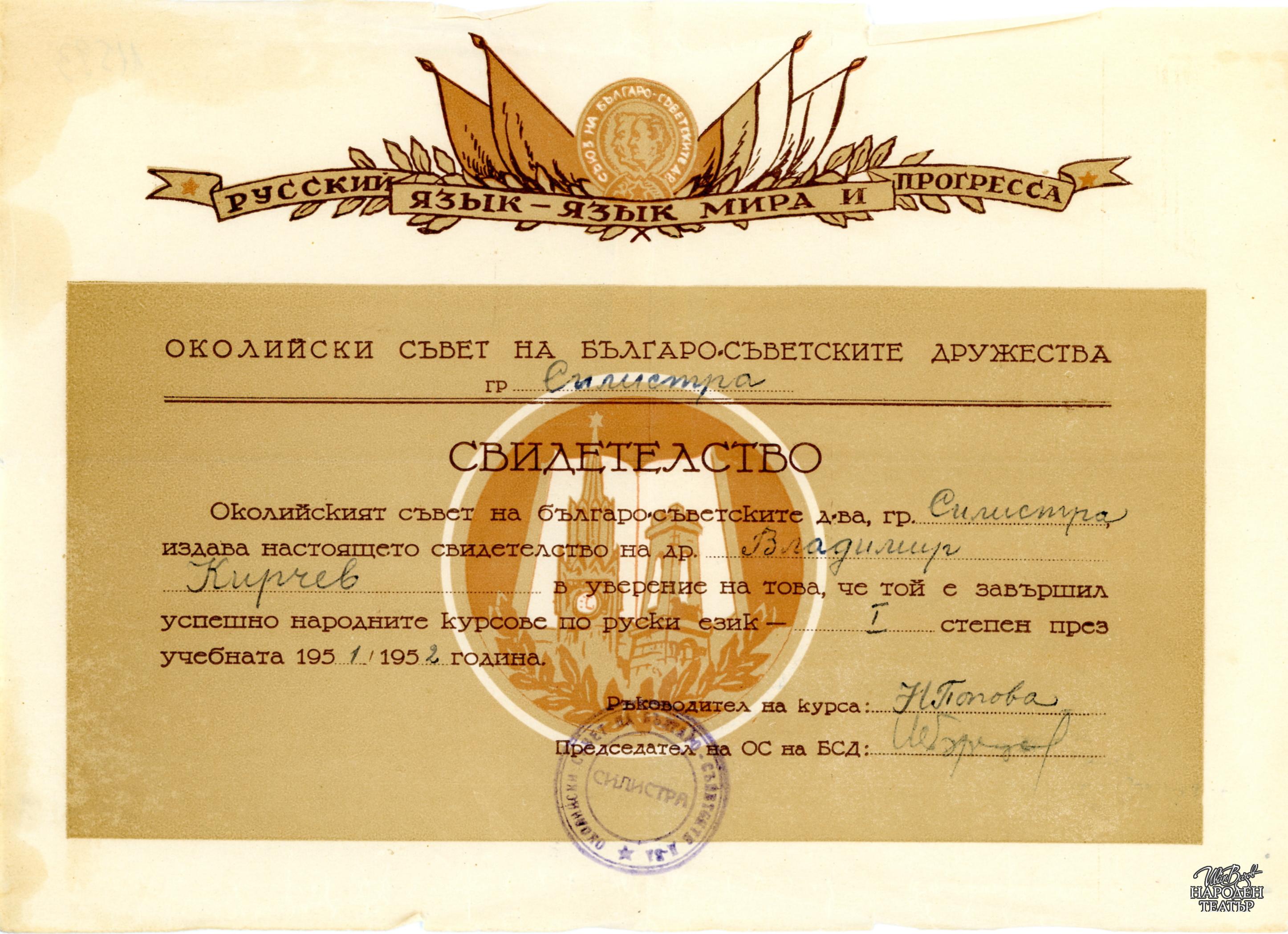 Удостоверение от Околийски съвет на българо-съветските дружества в Силистра на Владимир Кирчев в уверение, че е завършил курсове по руски език 1951/1952
