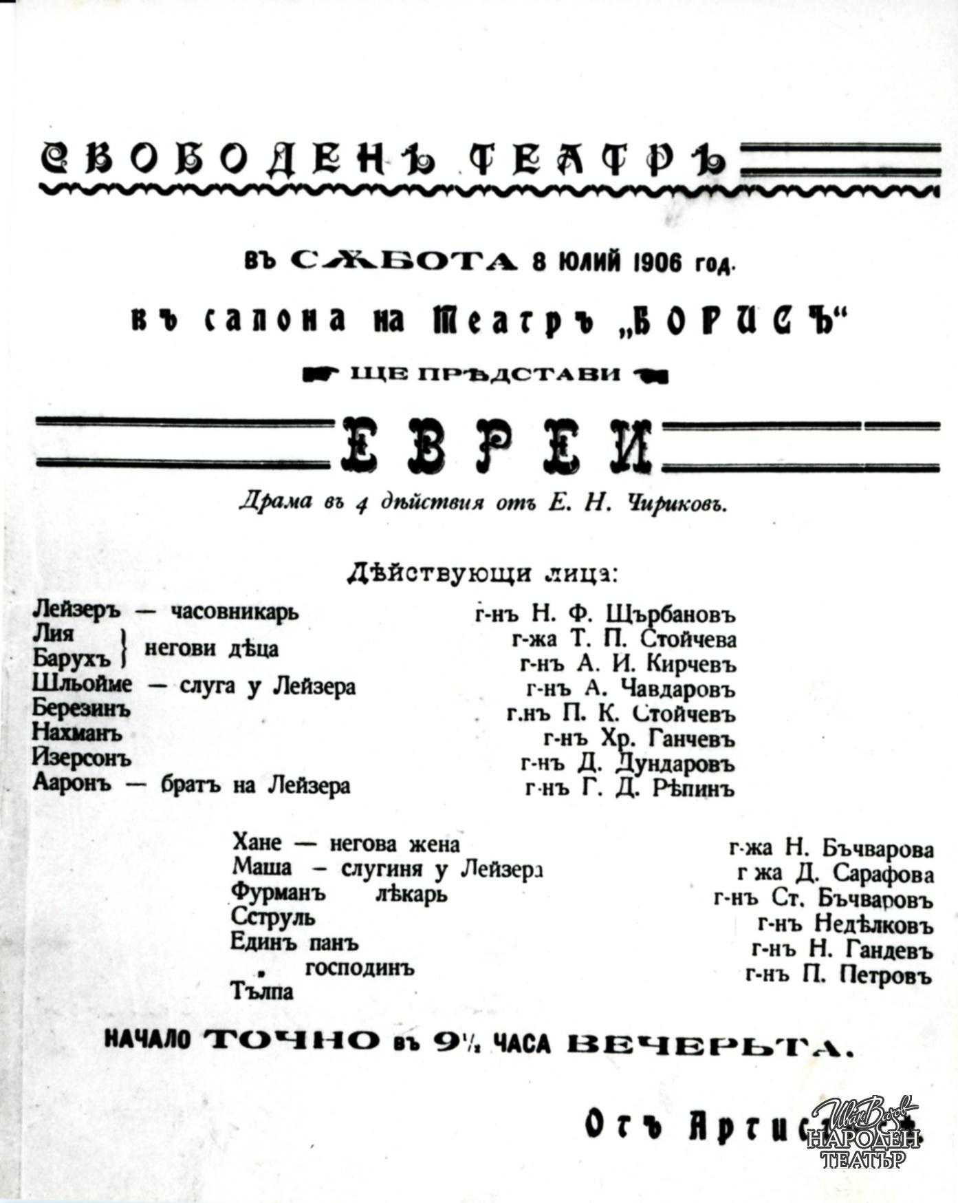 Фотокопие на афиш на Свободен Театър за представление на "Евреи" от Е. Чириков на 8.7.1906