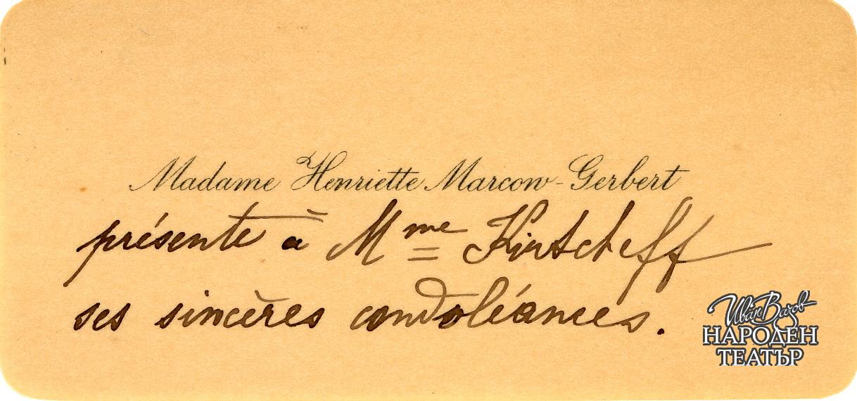 Съболезнователна визитка от Henriette Marcon-Gerbert до Елена Снежина по повод смъртта на Атанас Кирчев без дата