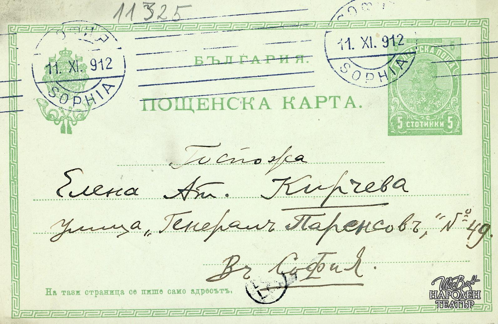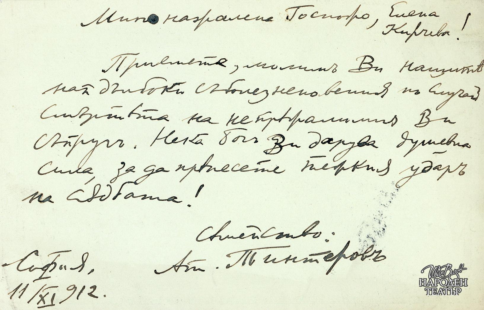 Картичка от семейство Ат. Тинтеров до Елена Снежина по повод смъртта на Атанас Кирчев от София от 11.11.1912