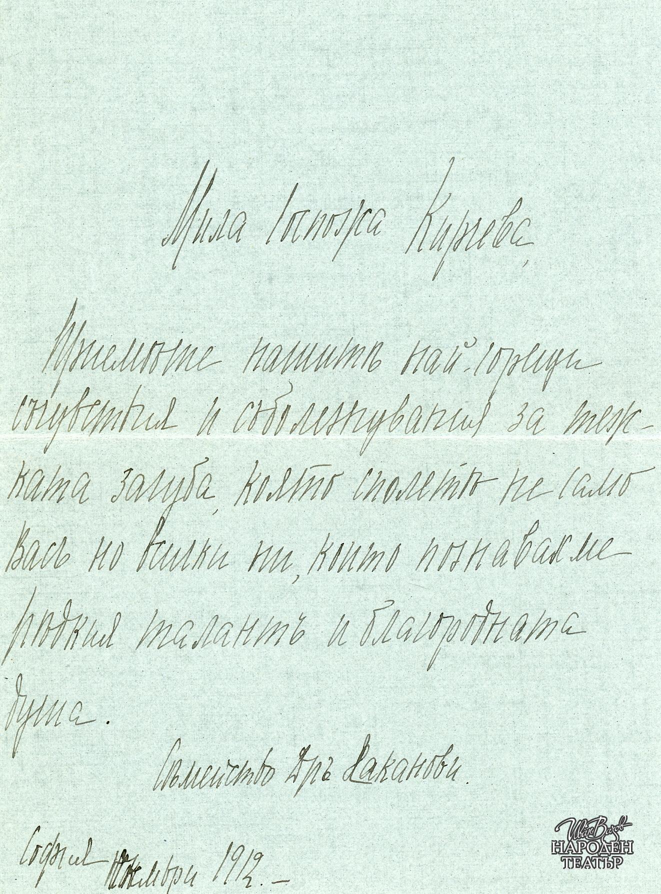 Писмо от семейство д-р Баканови до Елена Снежина по повод смъртта на Атанас Кирчев от София от 11.11.1912