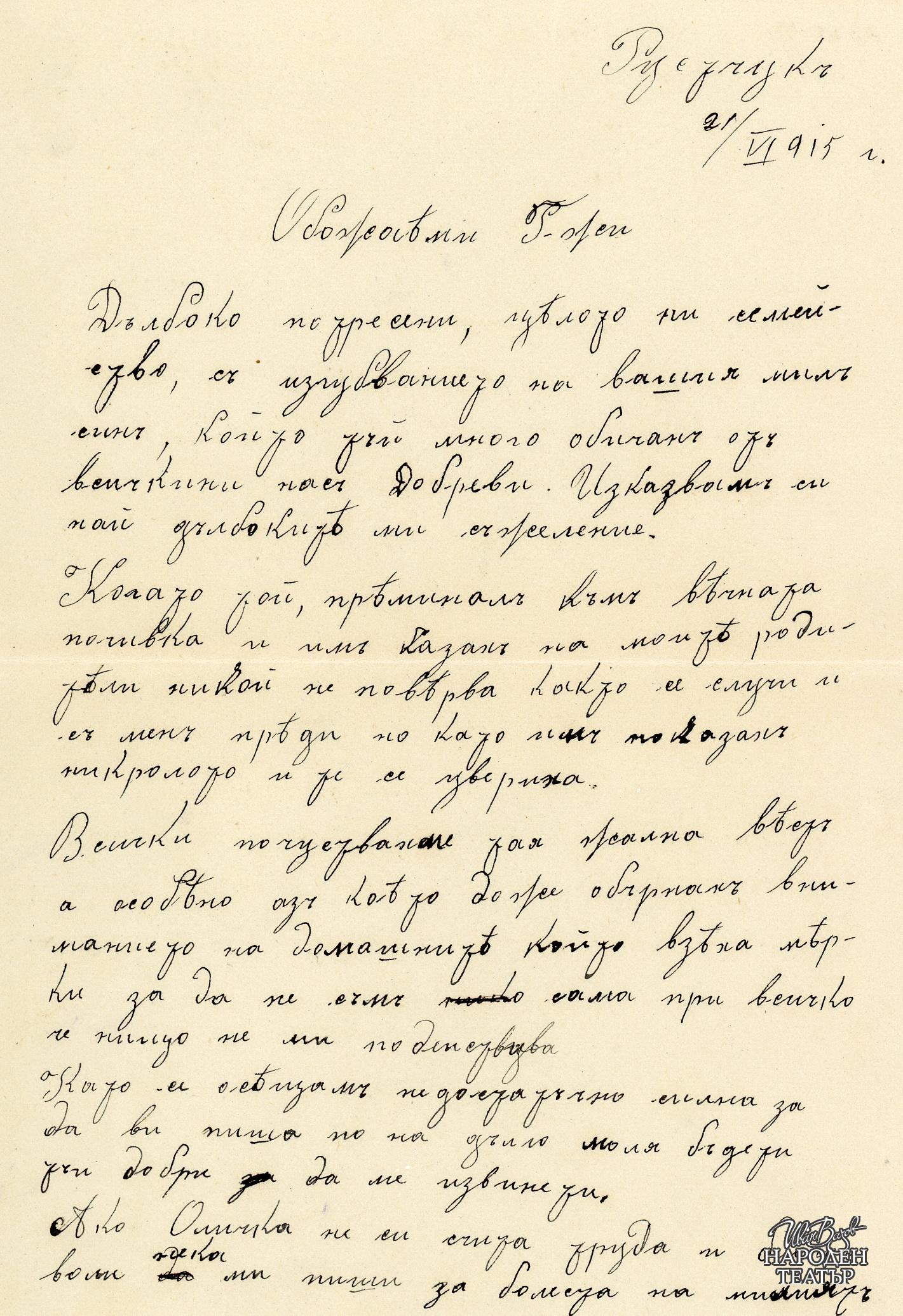 Писмо от Елена Добрева до Елена Снежина и майка й по повод смъртта на Неделю Янков от Русчук от 21.6.1915