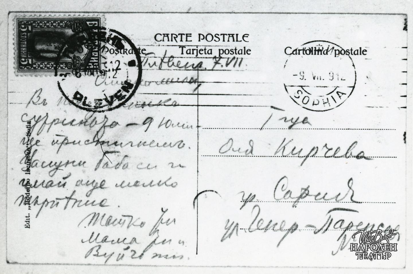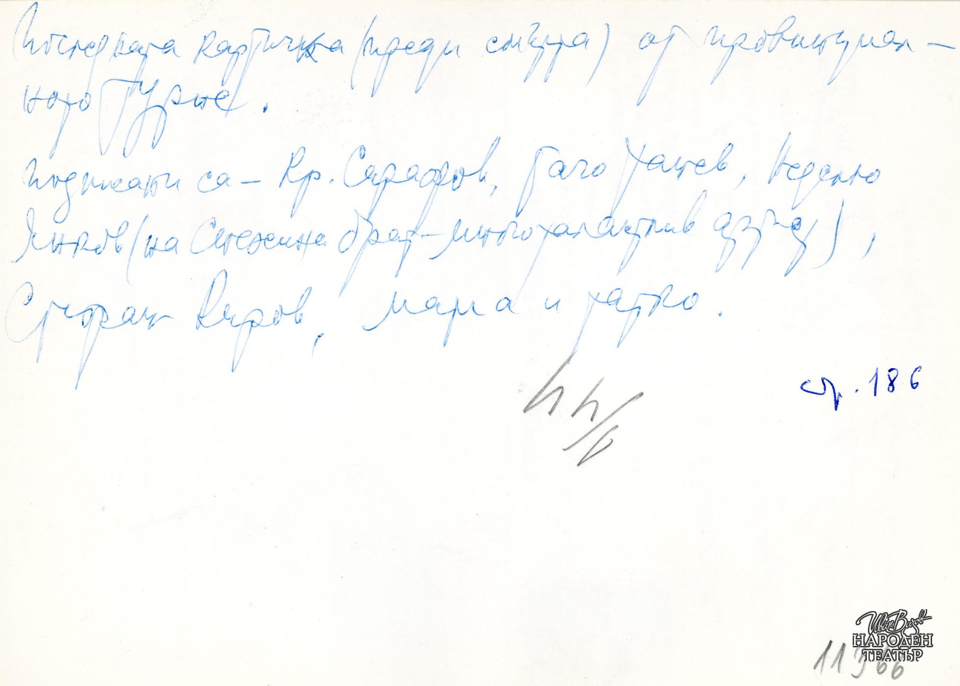 Забележка от Олга Кирчева: "последната картичка преди смъртта на татко от провинциалното турне. Подписани са: Кр. Сарафов, Тачо Танев, Неделю Янков, Стефан Киров, мама и татко". |
