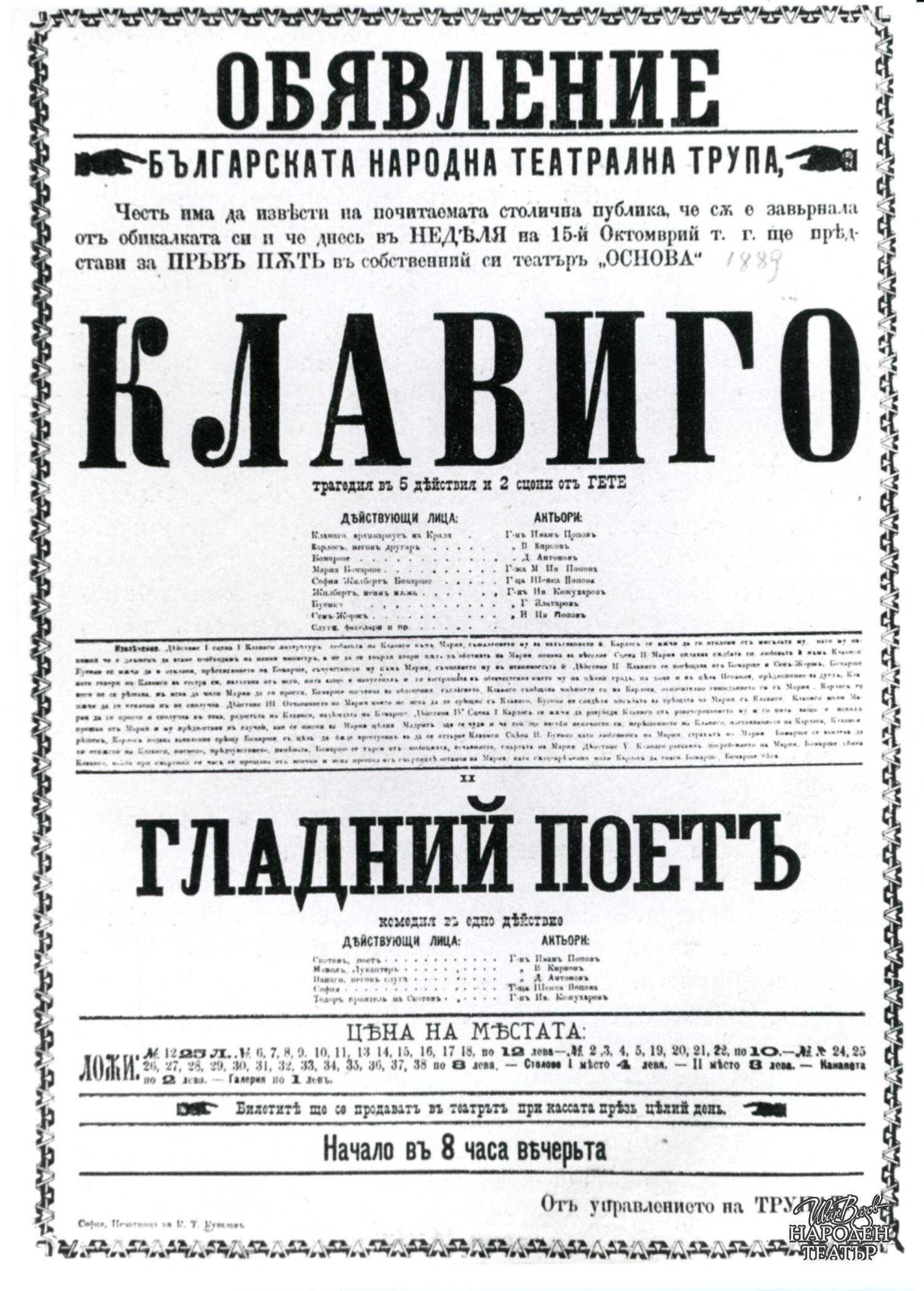 Фотокопие на афиш на Българска Народна Театрална Трупа за представление на "Клавиго" от В. Гьоте на 15.10.1889
