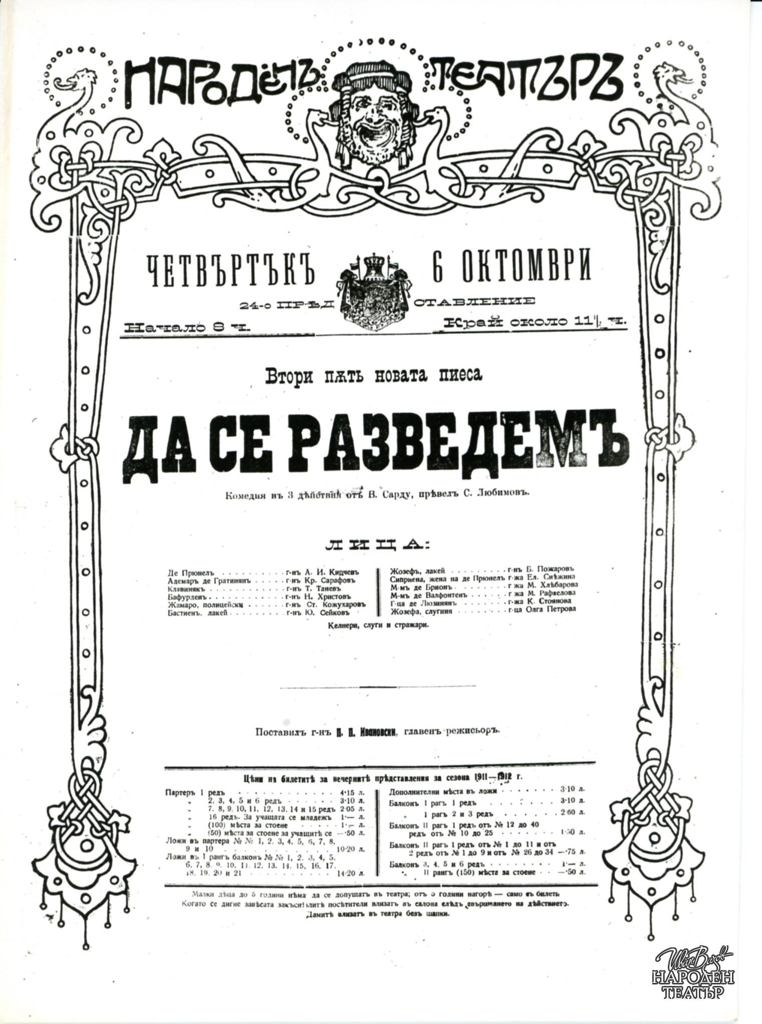 Фотокопие на афиш на Народен театър за представление на "Да се разведем" от В. Сарду на 6.10. няма година