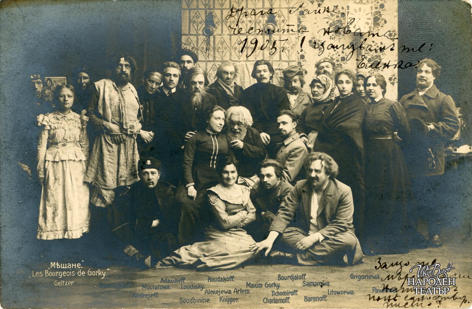 Снимка на Максим Горки и актьорите от МХАТ, участващи в "Еснафи" от М. Горки. |