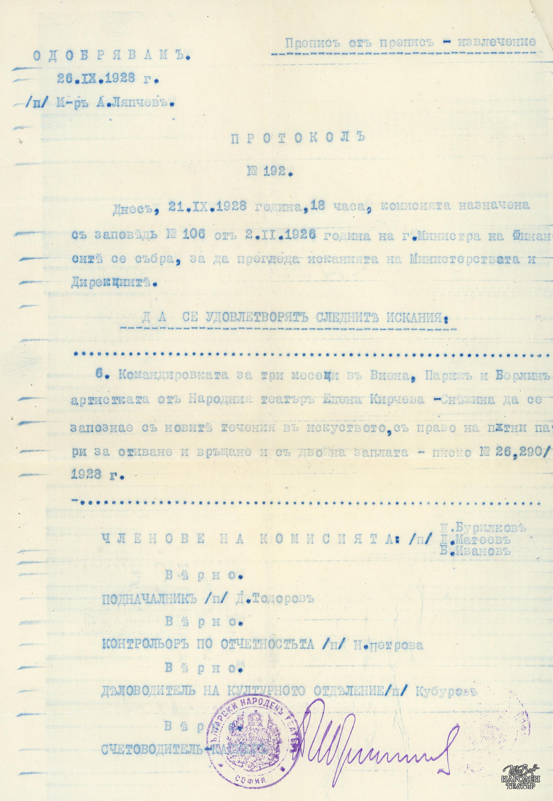 Препис от протокол № 192 от 29.1928 за творческа командировка на Елена Снежина в Париж, Виена и Берлин