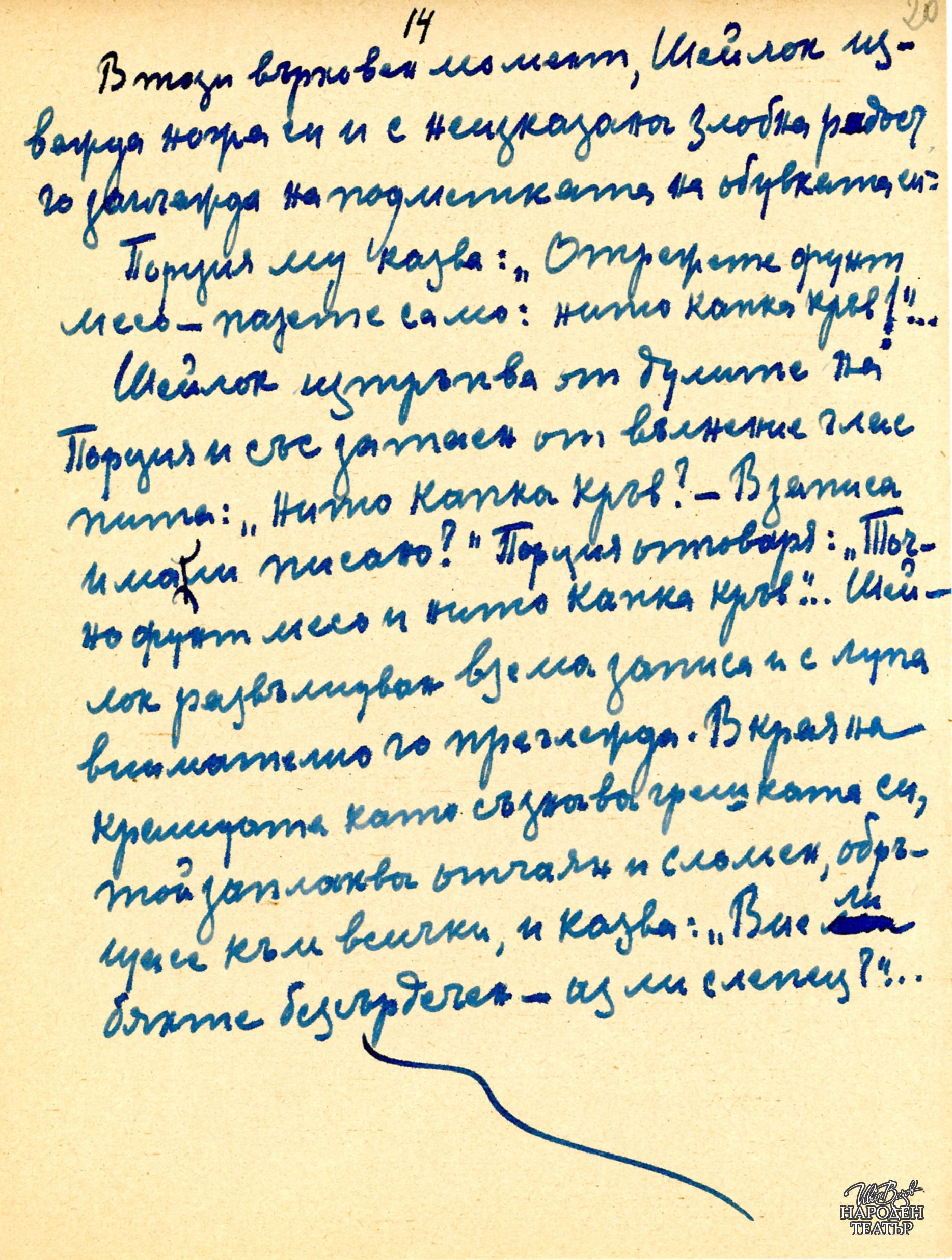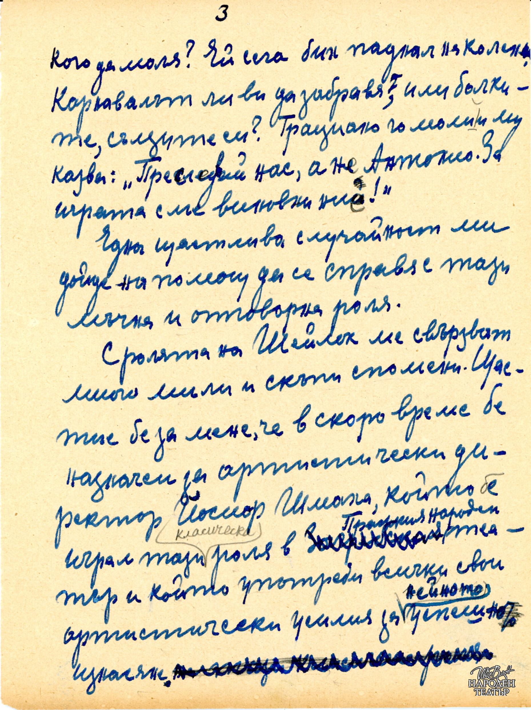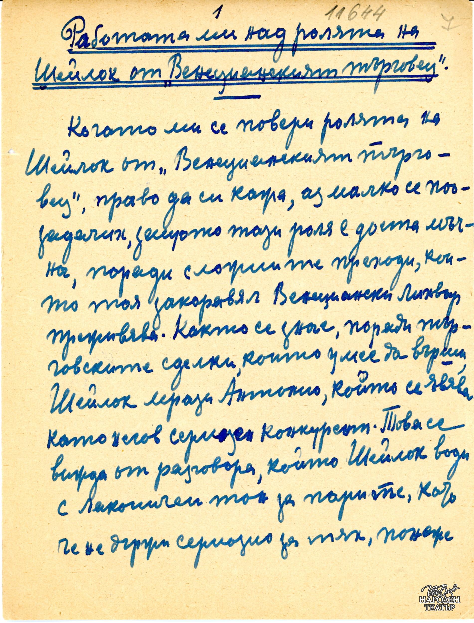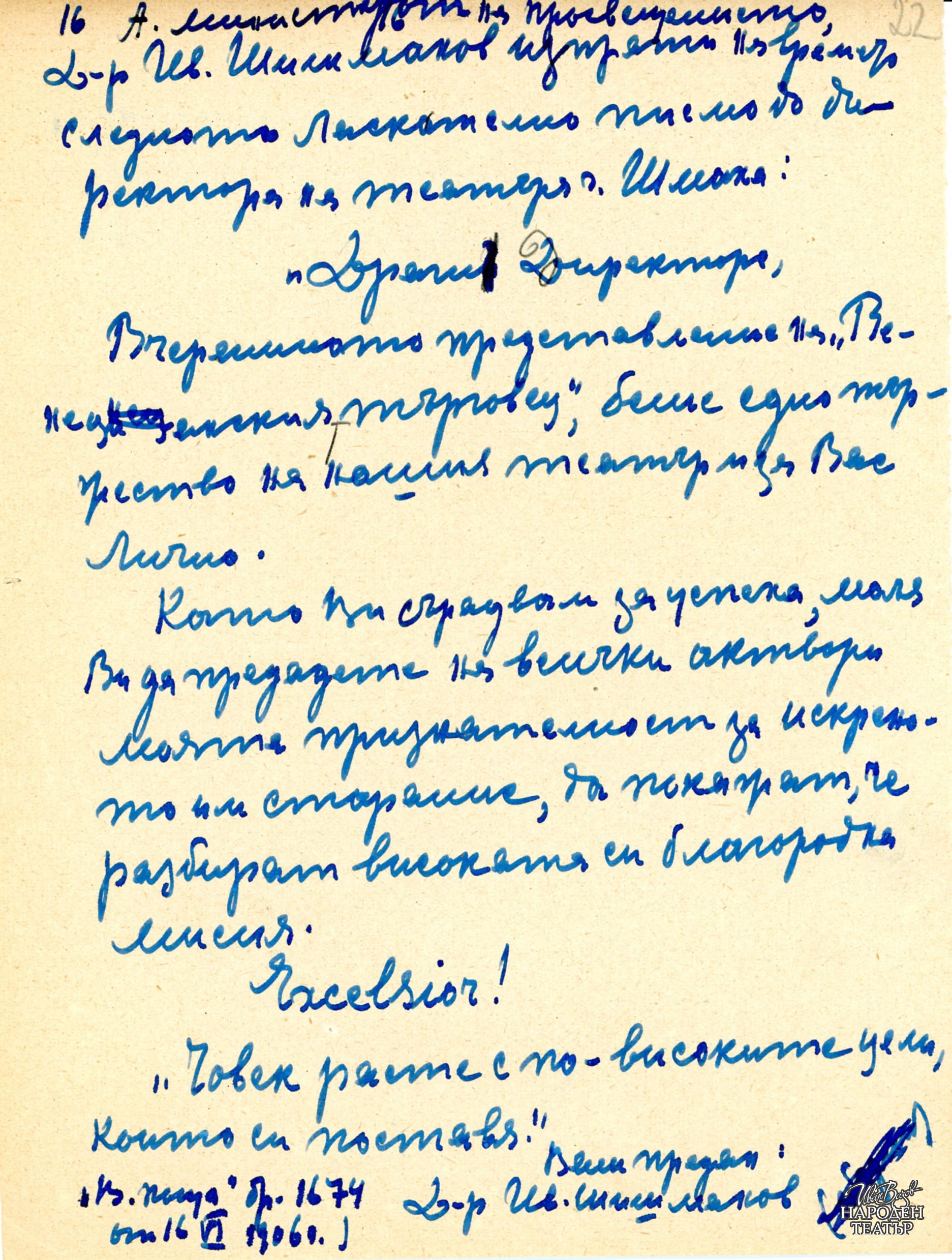 Препис на рецензия на проф.Иван Шишманов за спектакъла от "Вечерна поща" бр.1674 от 16.6.1906 |