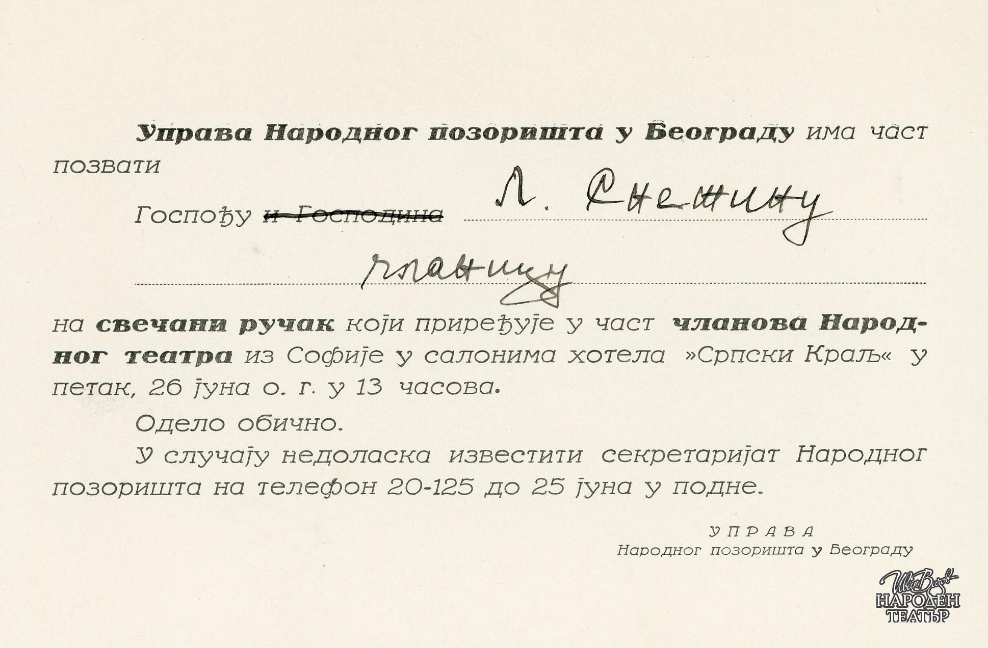 Покана от Управата на Народно позорище Белград до Елена Снежина за официална вечеря в чест на членовете на Народния театър от София от 26.6.1936