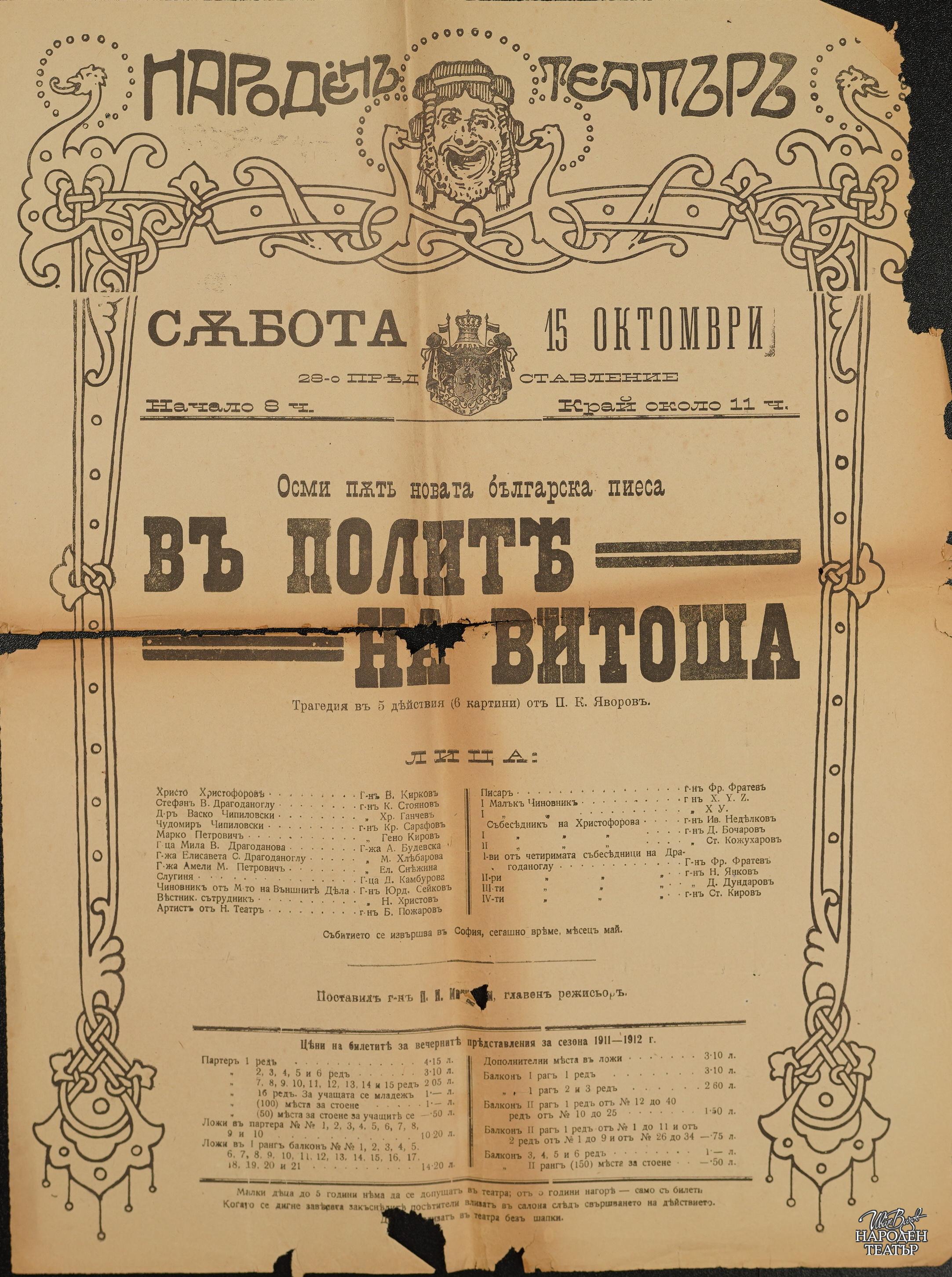 Забележка: Осмо представление на 15.10., сезон 1911-1912.