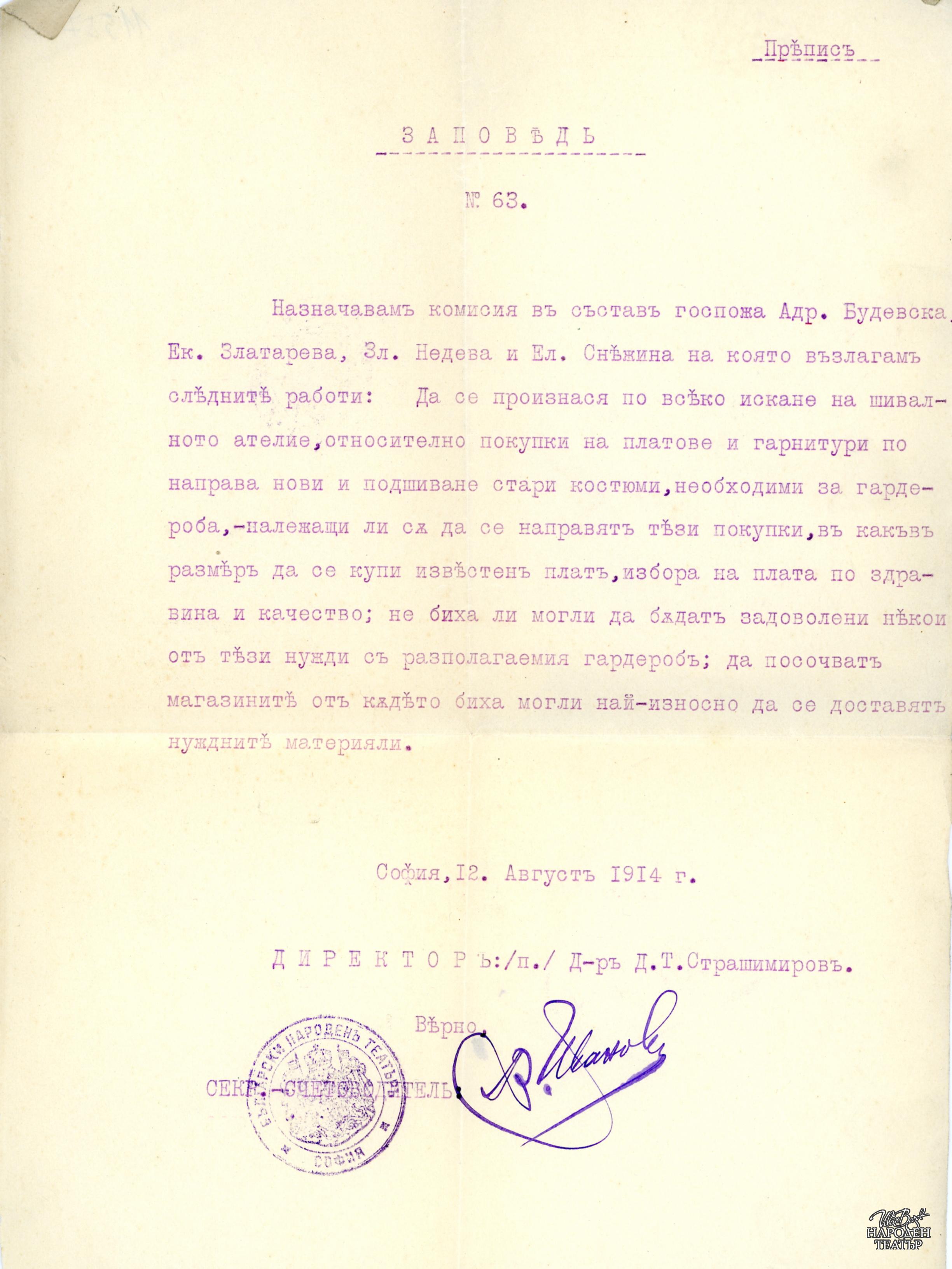 Заповед от Д.Т.Страшимиров, директор на театъра за назначаване на Елена Снежина в комисия за покупка на материали за гардероба на театъра