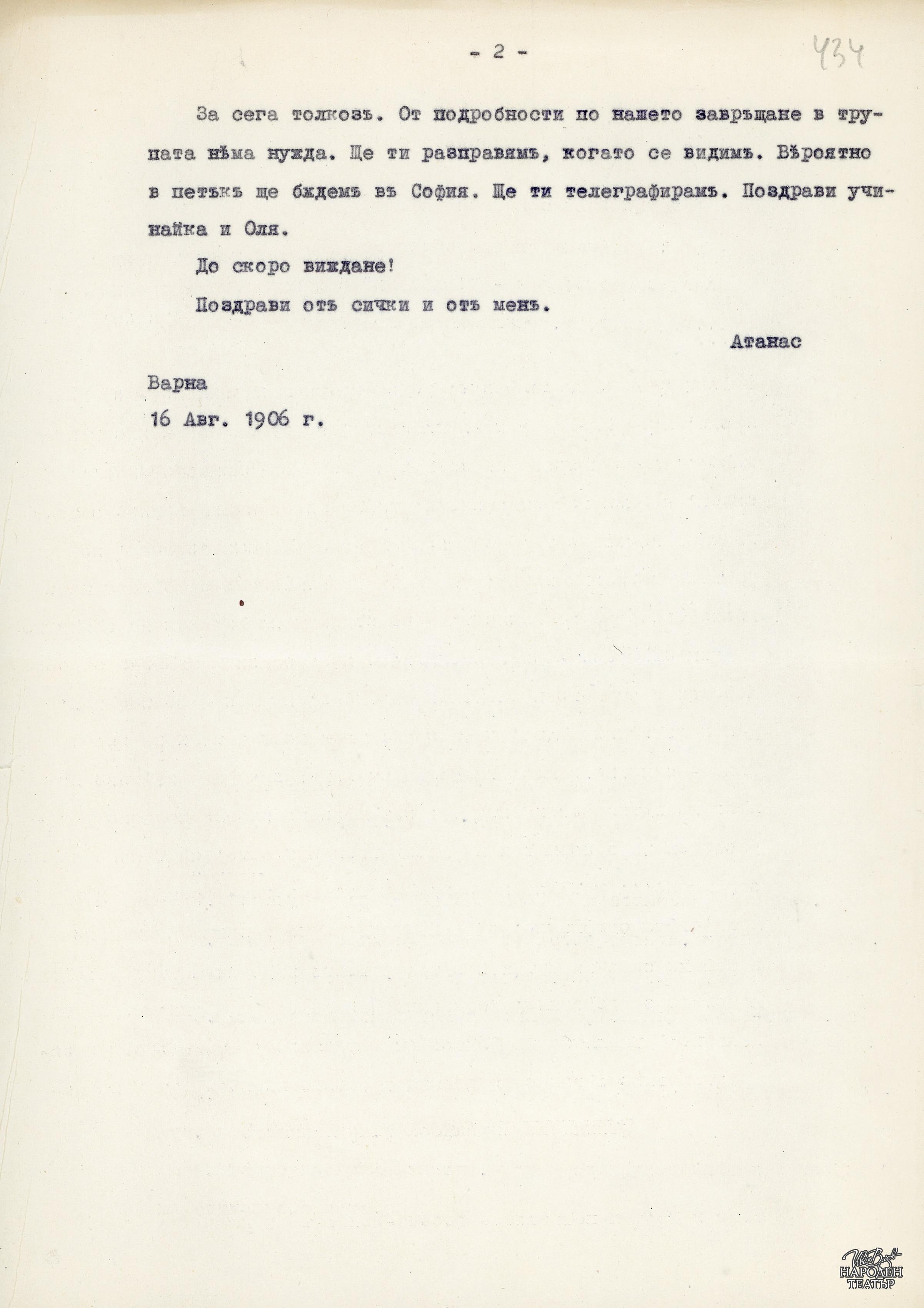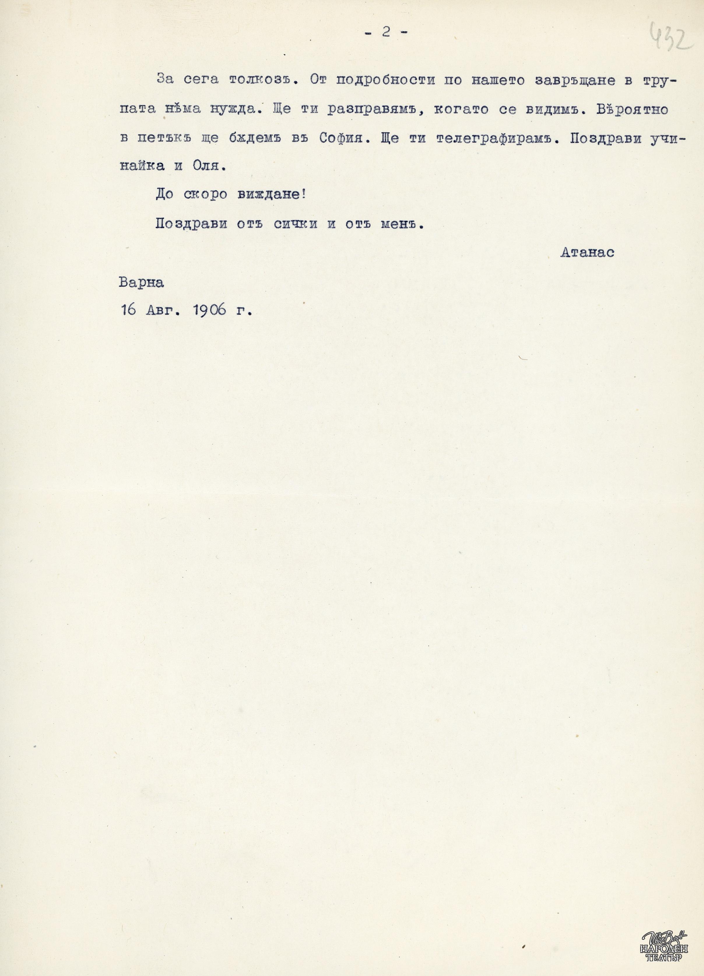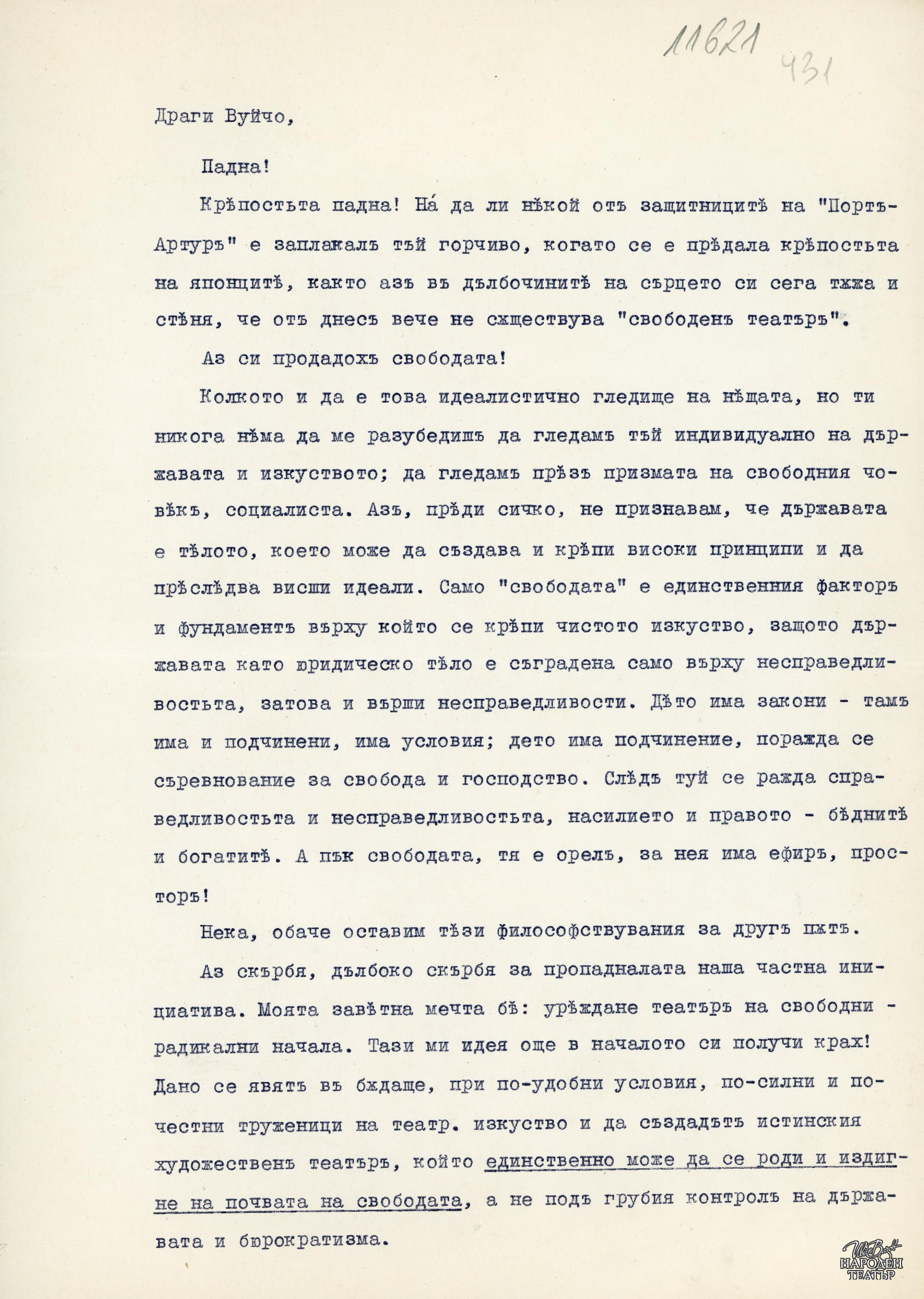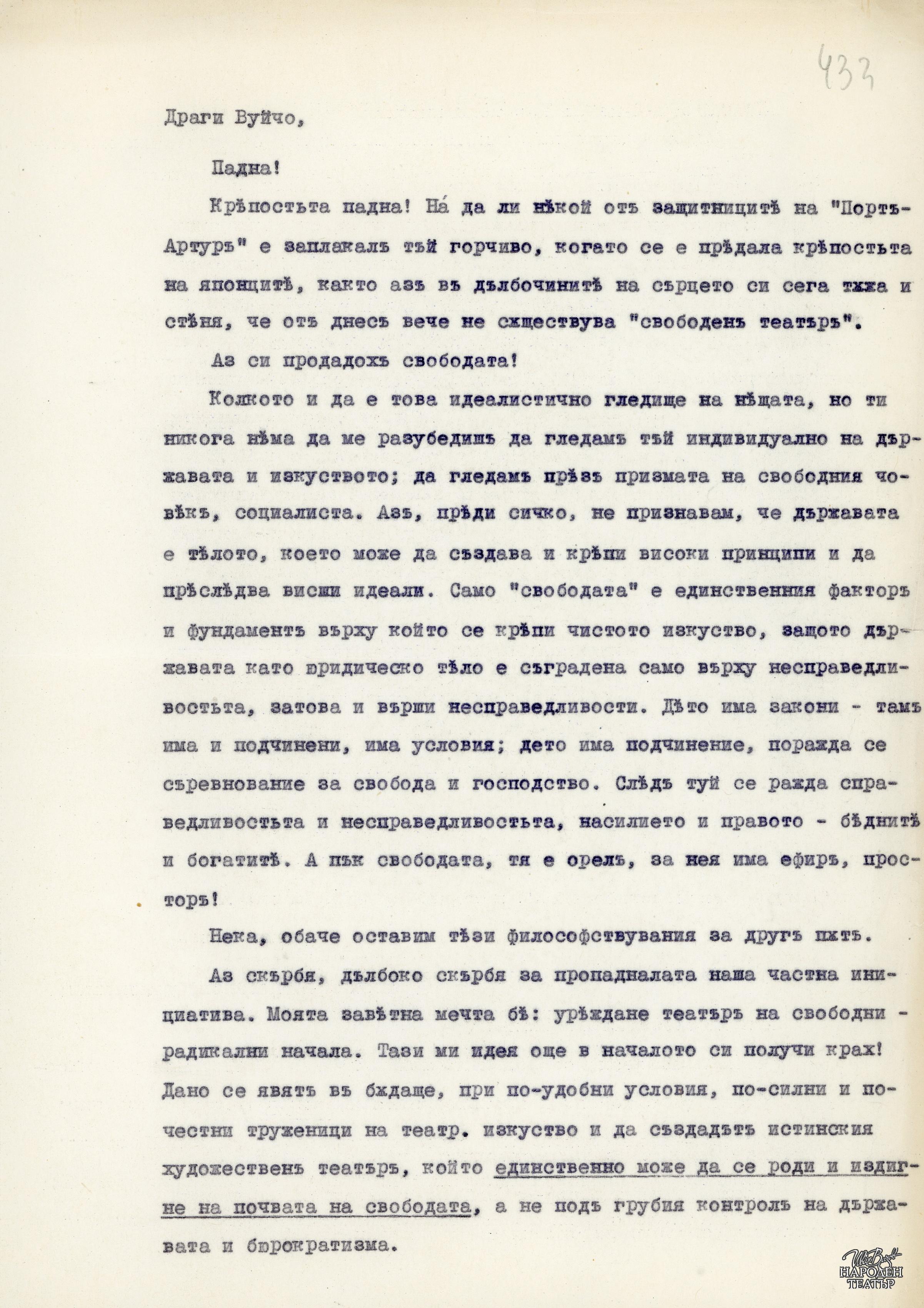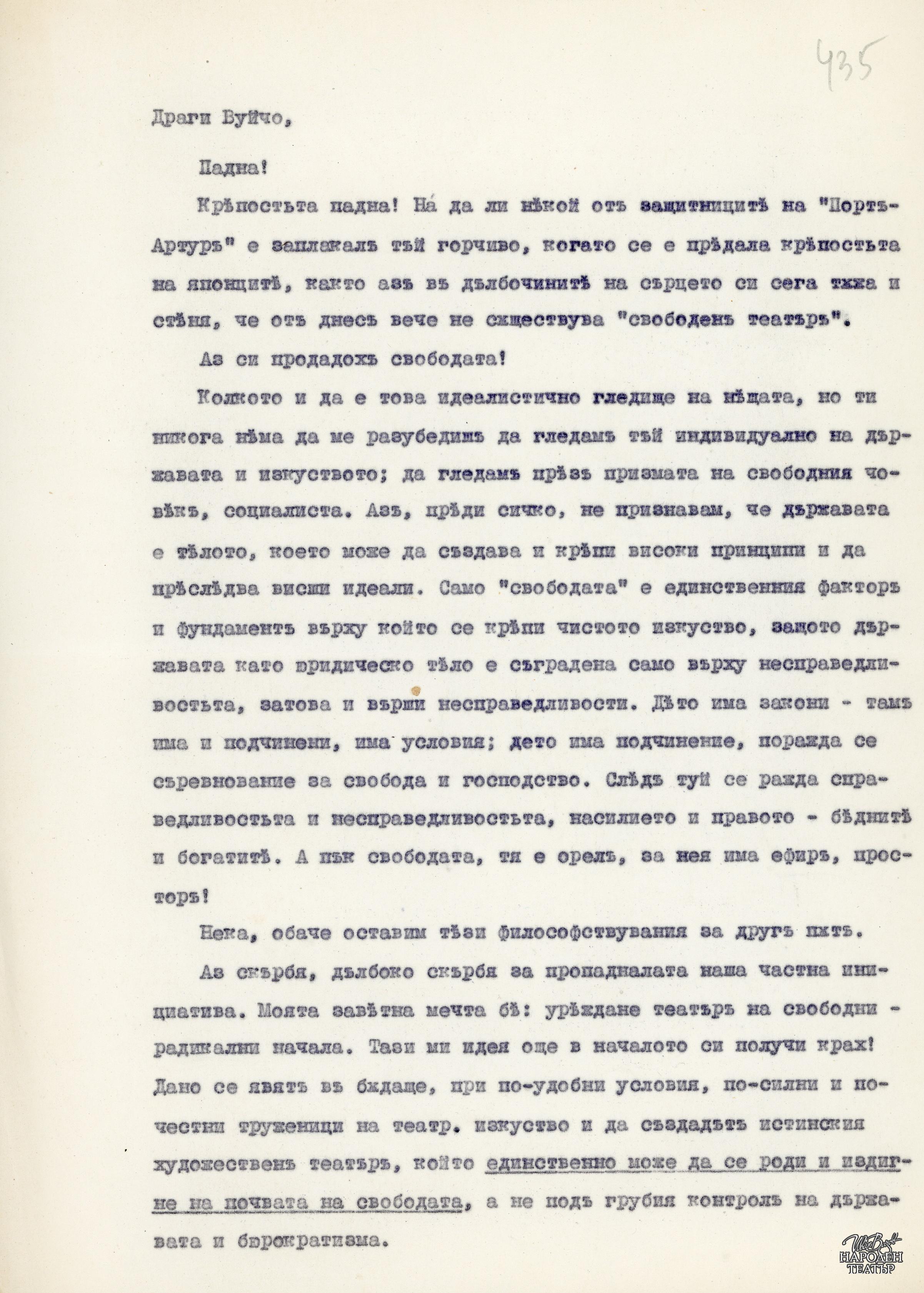 За закриването на "Свободен театър" (машинописен препис) |