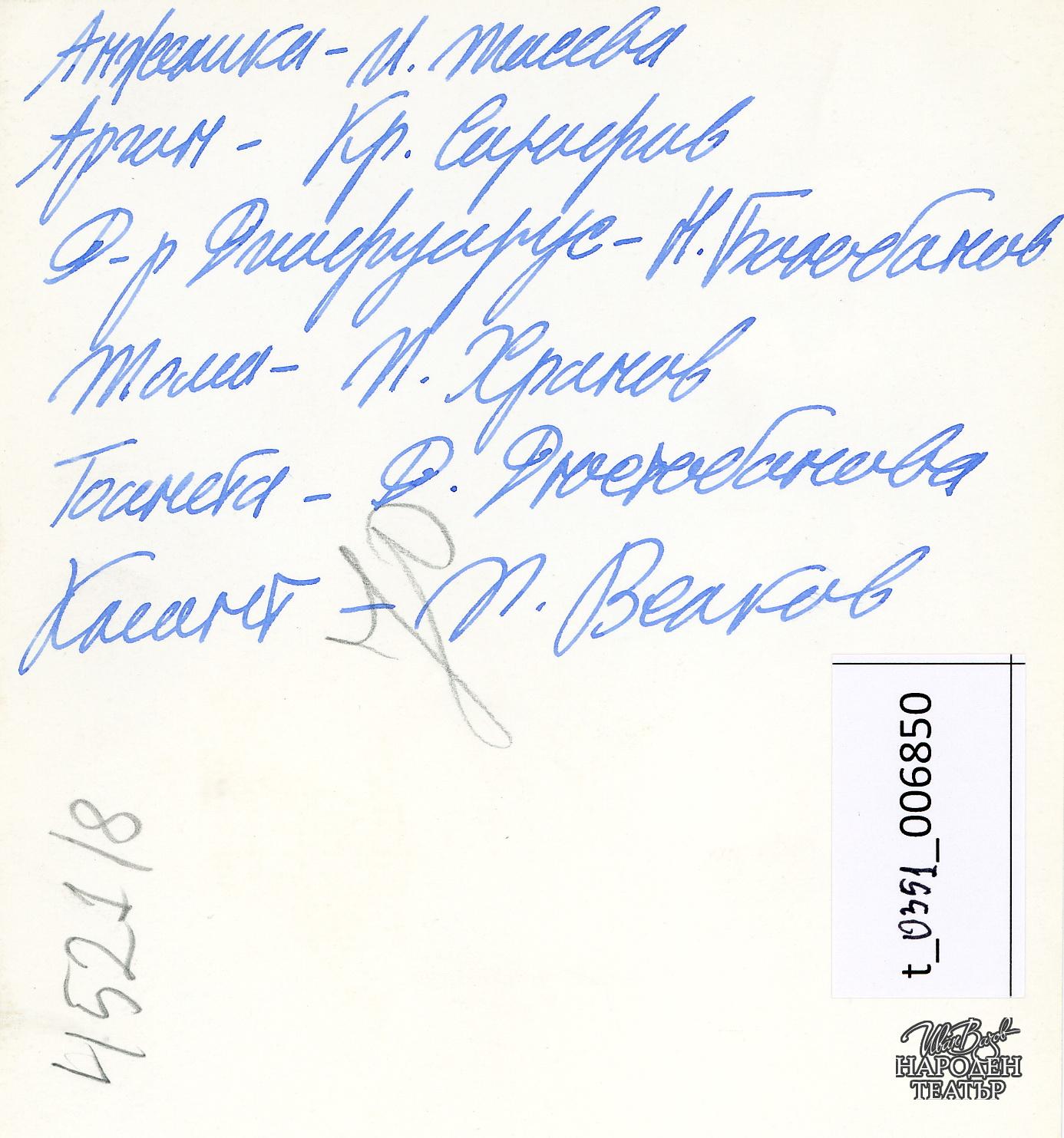 Ирина Тасева, Кръстьо Сарафов, Никола Балабанов, Пантелей Хранов, Дора Дюстабанова, Порфирий Велков |