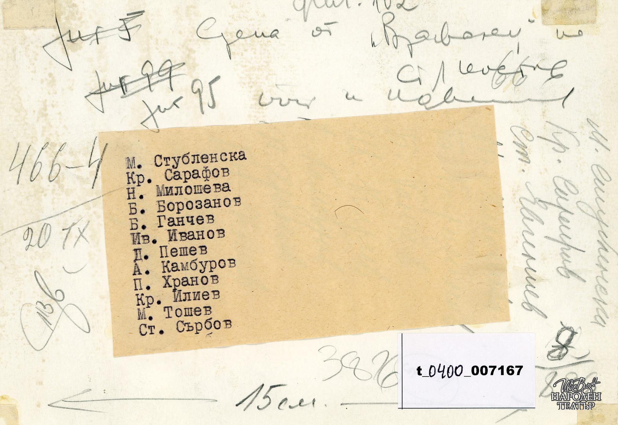 Милка Стубленска, Кръстьо Сарафов, Невена Милошева, Борис Борозанов, Борис Ганчев, Иван Иванов, Димитър Пешев, Асен Камбуров, Пантелей Хранов, Кръстьо Илиев, Марин Тошев, Стефан Сърбов |