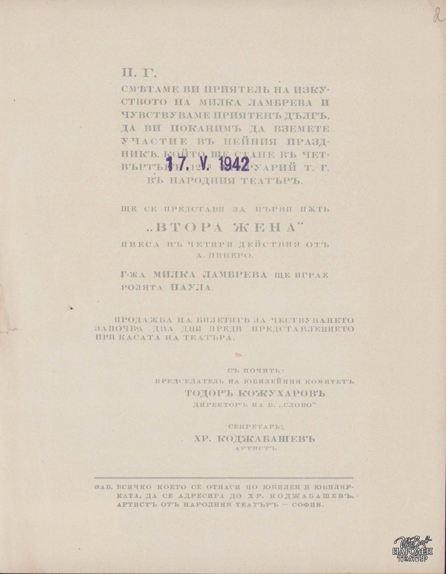 Покана за премиерата на постановката "Втора жена" от А. Пинеро, с която се честват 30-години от дебюта на актрисата Милка Ламбрева на сцената на Народния театър. |