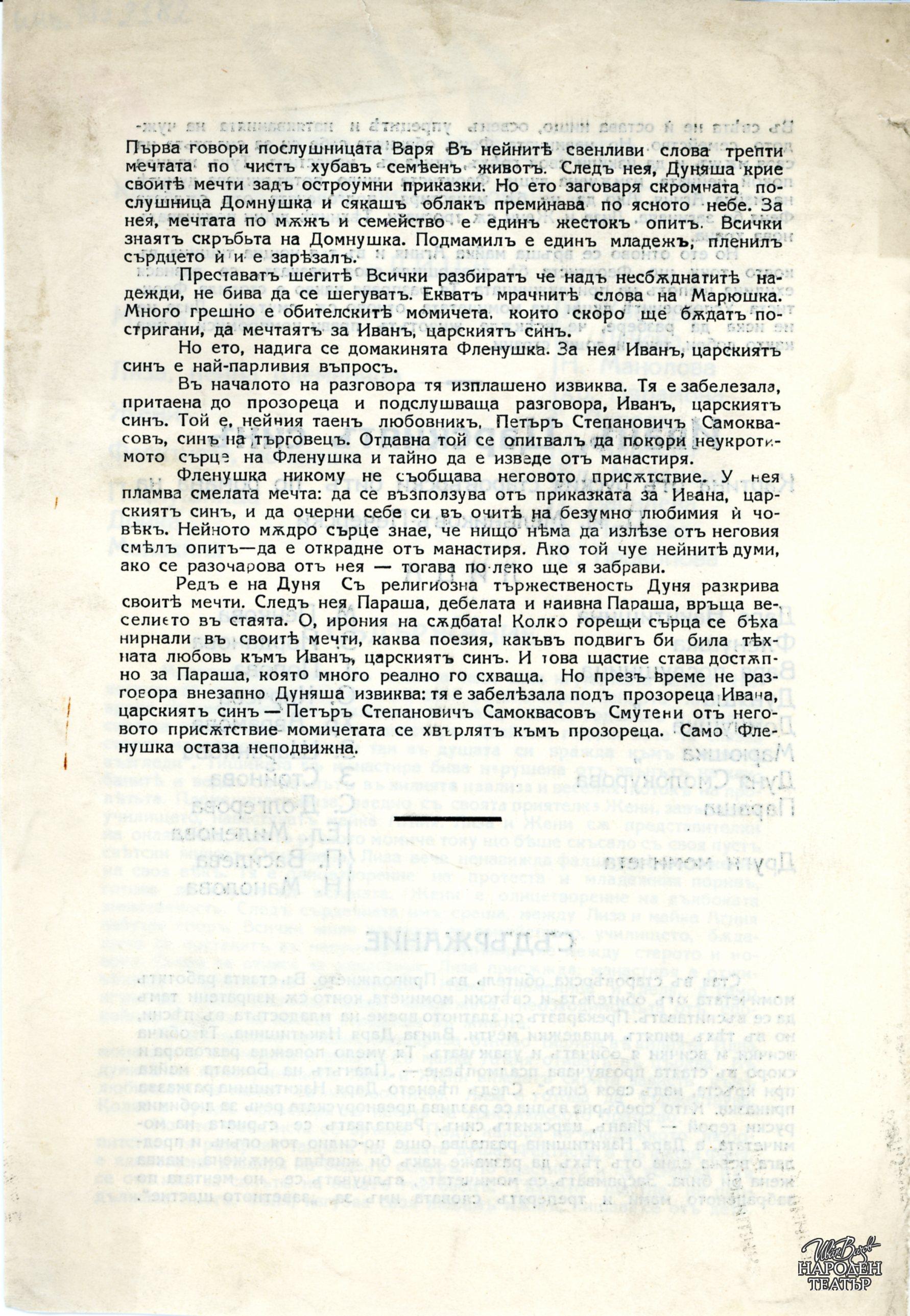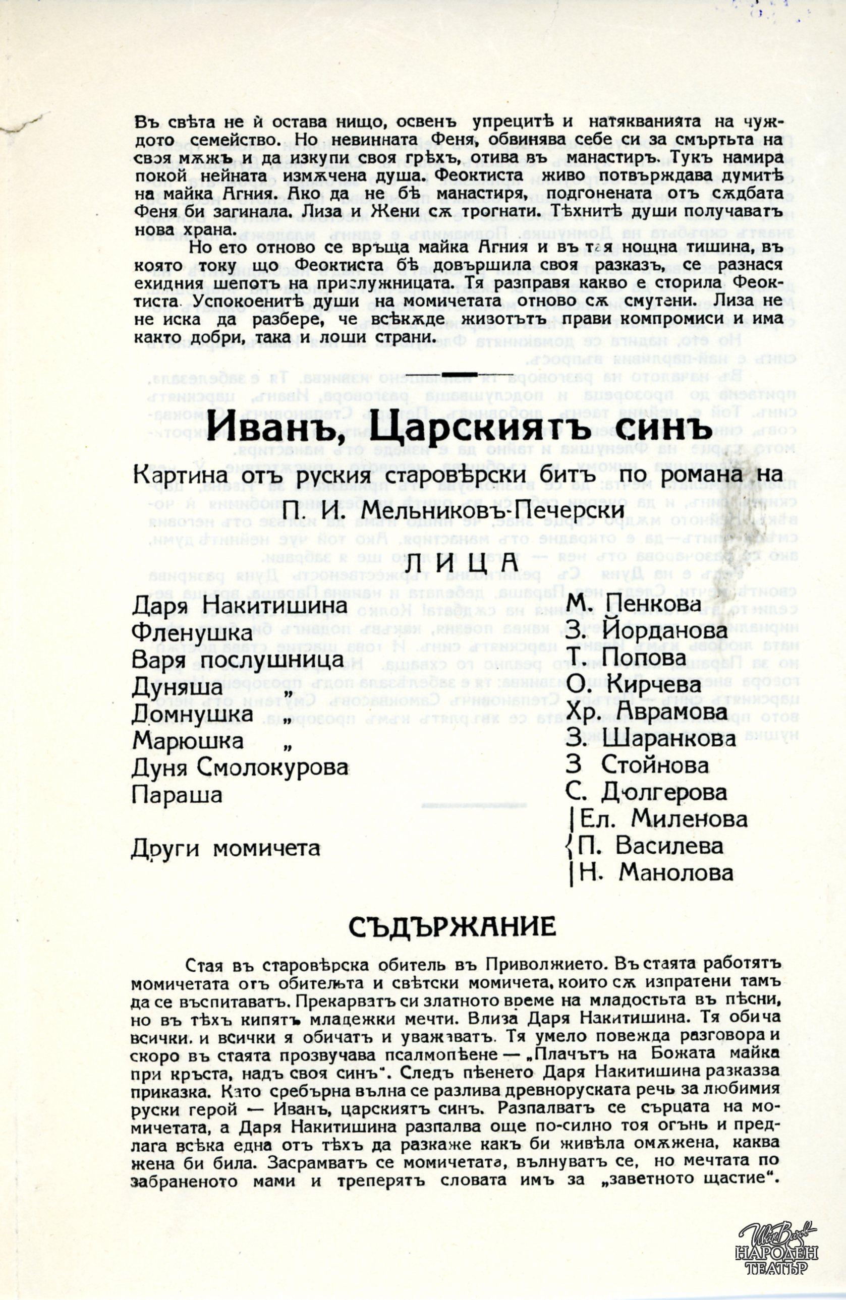 В същата програма: "Иван, Царският син" по романа на Павел И. Мелников-Печерски, пост. Николай О. Масалитинов (премиерен № 323). |