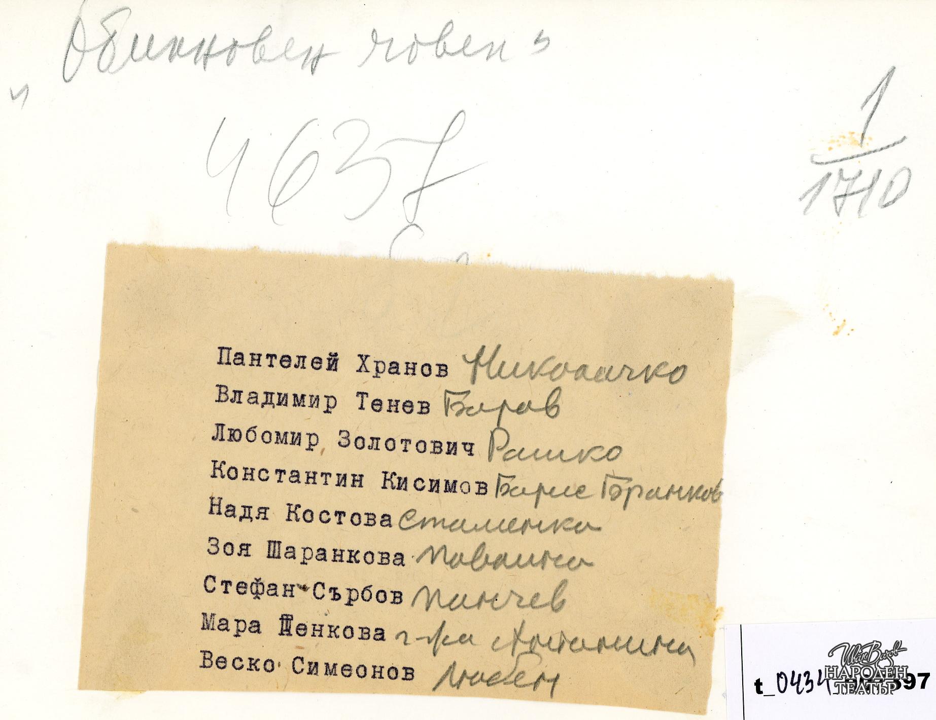 Пантелей Хранов, Владимир Тенев, Любомир Золотович, Константин Кисимов, Надежда Костова, Зоя Шаранкова, Стефан Сърбов, Мара Пенкова, Веселин Симеонов |