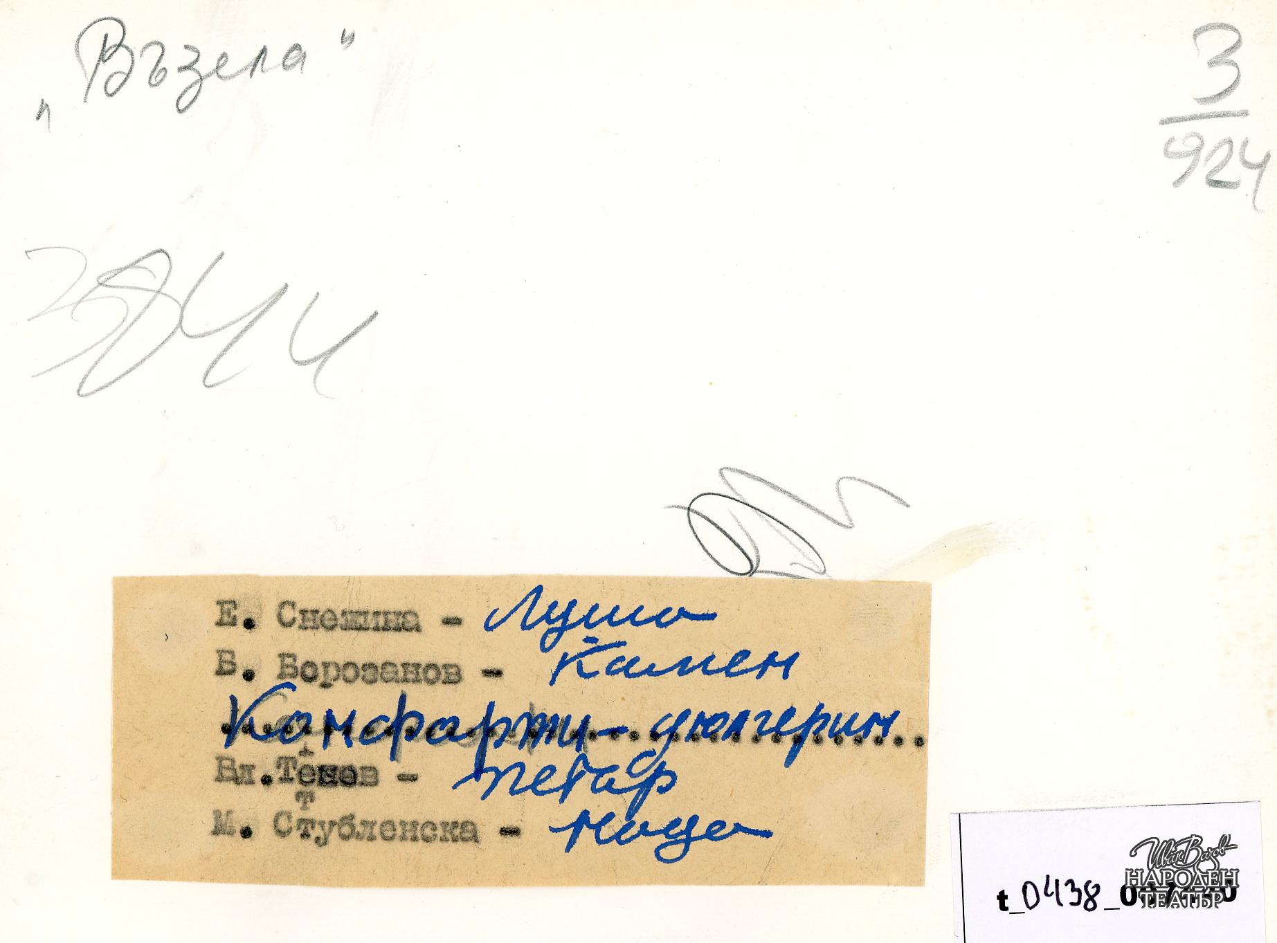 Лица: Елена Снежина, Борис Борозанов, Лео Конфорти, Владимир Тенев, Милка Стубленска