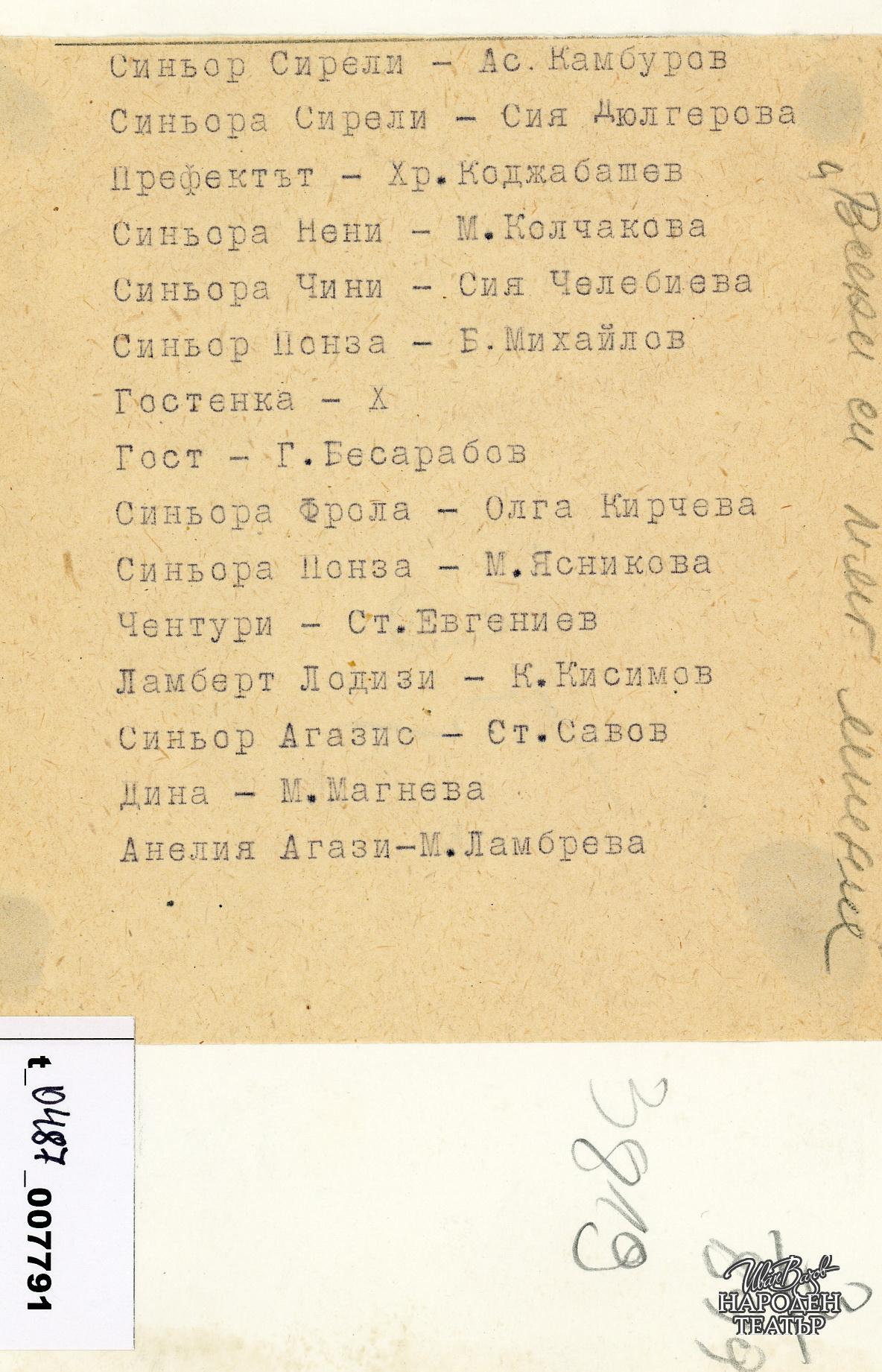 Асен Камбуров, Сия Дюлгерова, Христо Коджабашев, Магда Колчакова, Сия Челебиева, Борис Михайлов, Георги Бесарабов, Олга Кирчева, Мария Ясникова, Стоян Евгениев, Константин Кисимов, Стефан Савов, Милка Магнева, Милка Ламбрева |