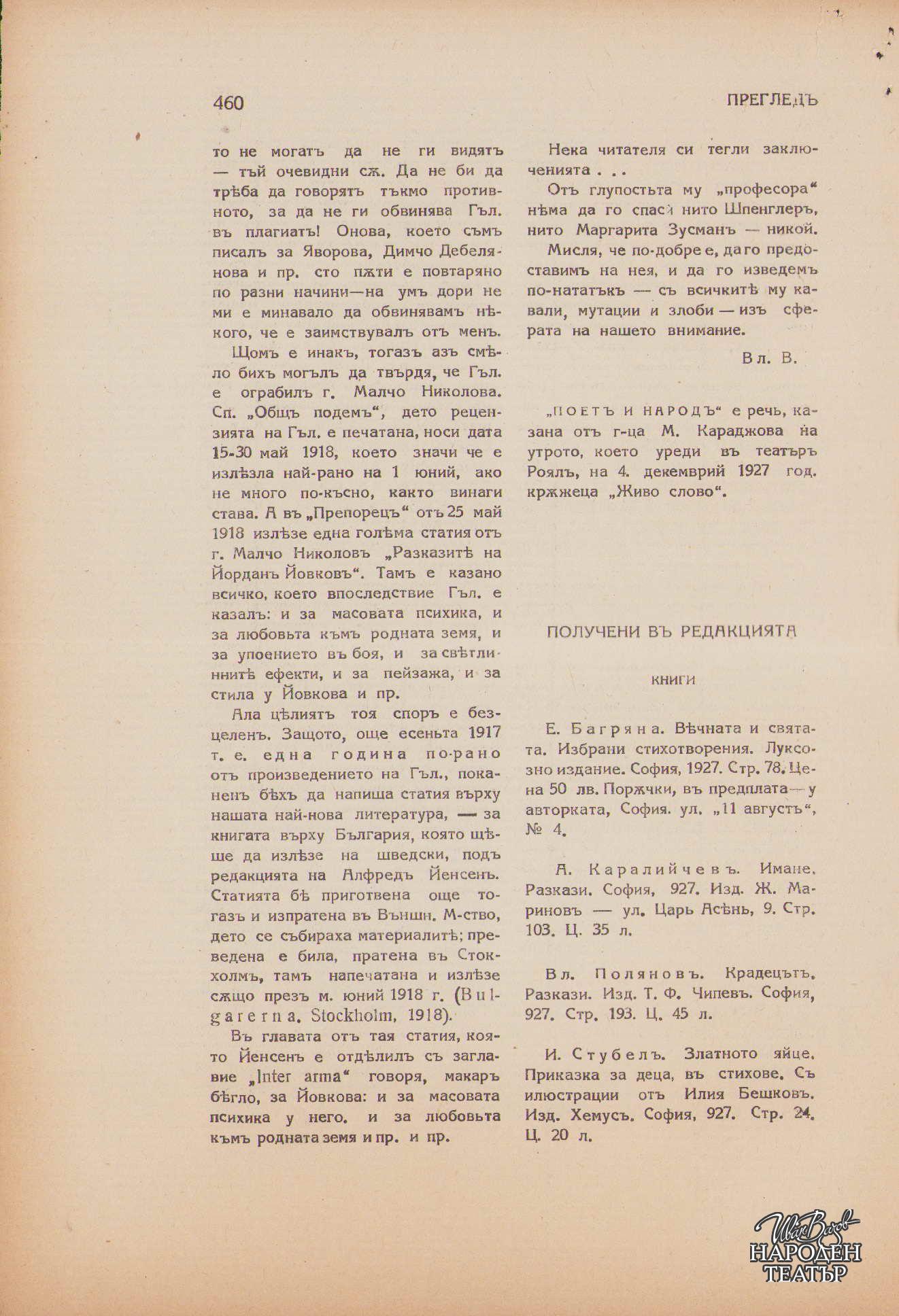 сп. Златорог, VIII, 1927, кн. 10, с. 456-460 |